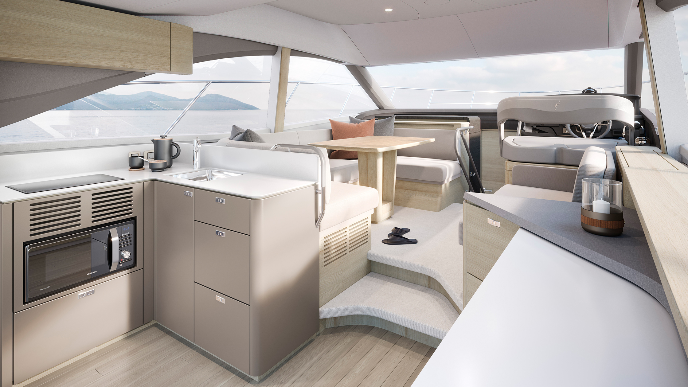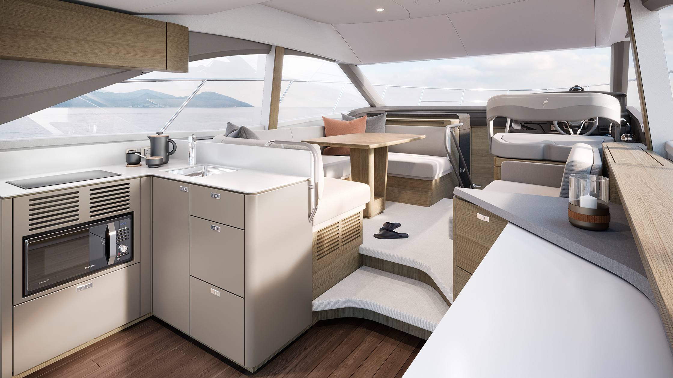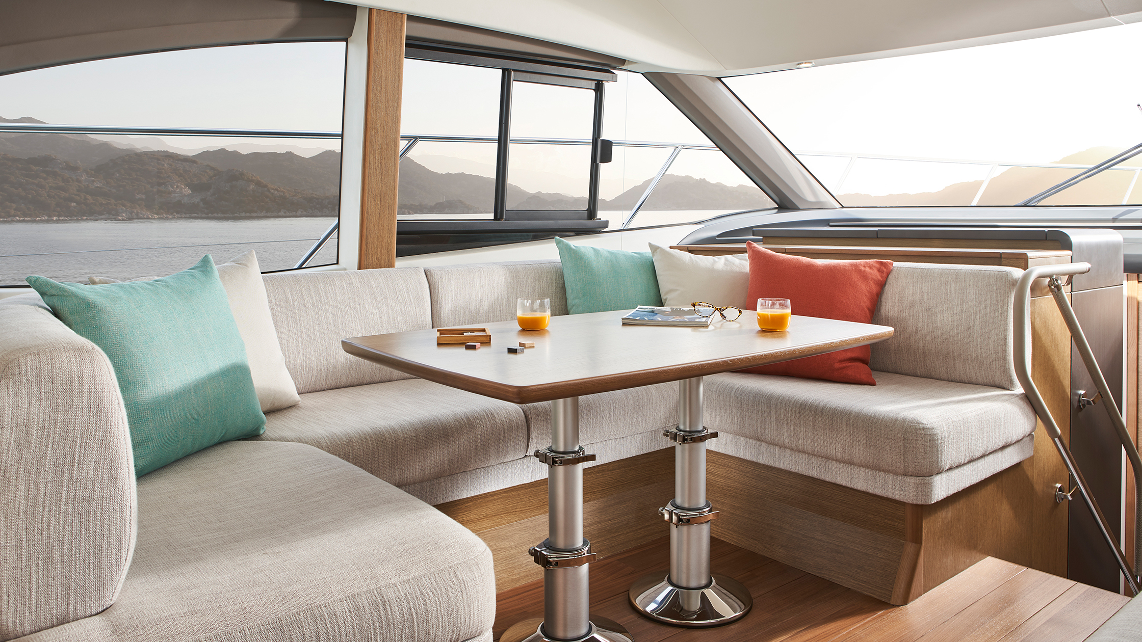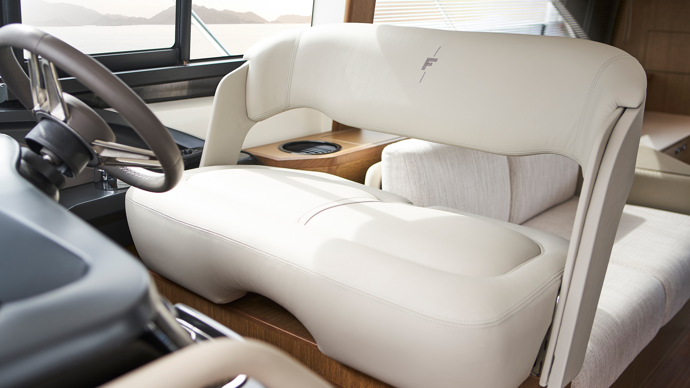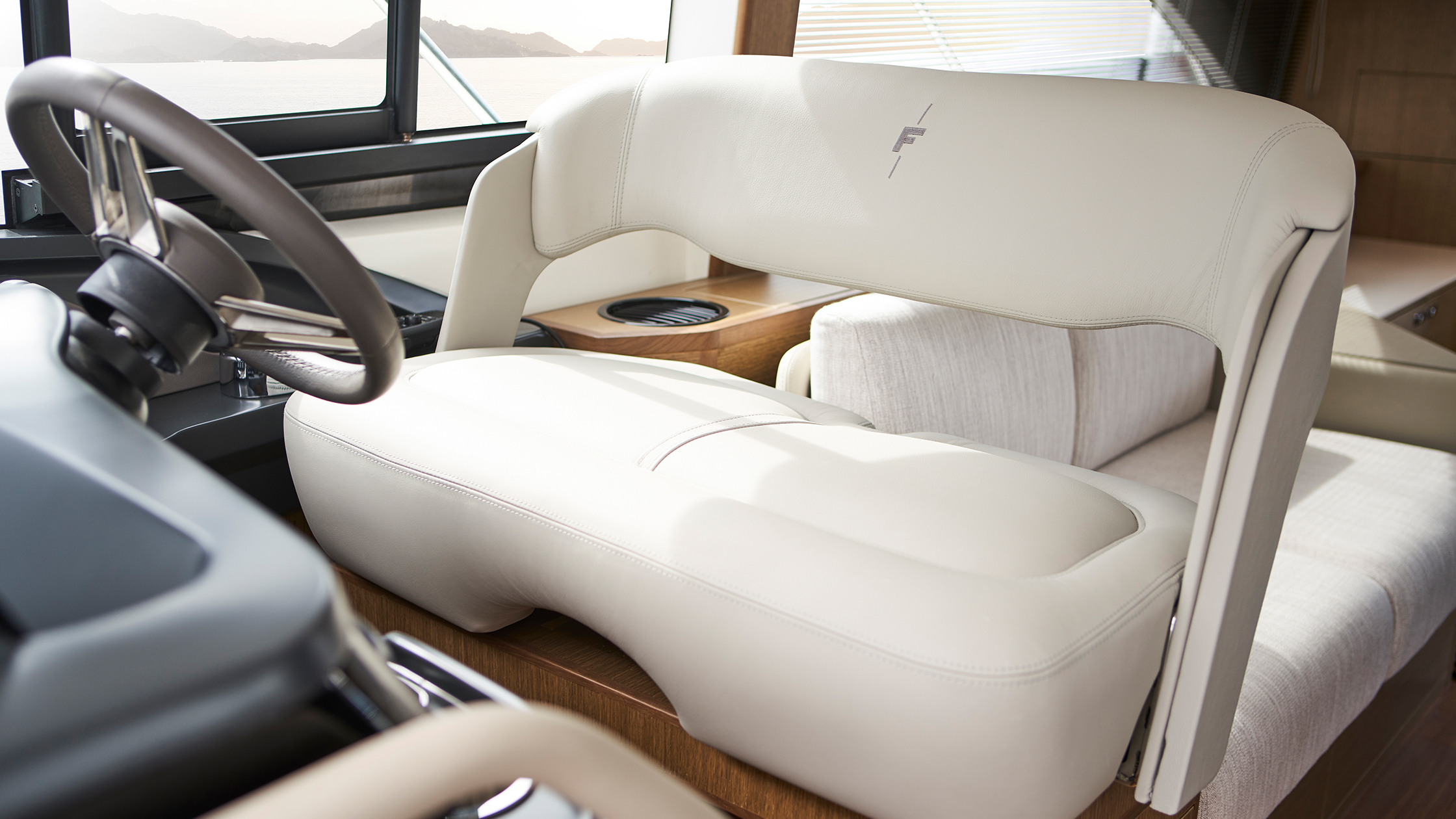 Die verlängerte Flybridge der F45 umfasst einen Sitzbereich mit einem Teakholz-Esstisch und L-förmige Sitze vorn, die sich bei Bedarf in eine Sonnenliegen umwandeln lassen. Und auf Knopfdruck lässt sich die einzigartige, elektrisch verschiebbare Sitzbank am Heckspiegel des Hauptdecks auf die gesamte Länge des Cockpitbereichs ausfahren und bietet so für eine 14,4-Meter-Yacht konkurrenzlos viel Platz.
