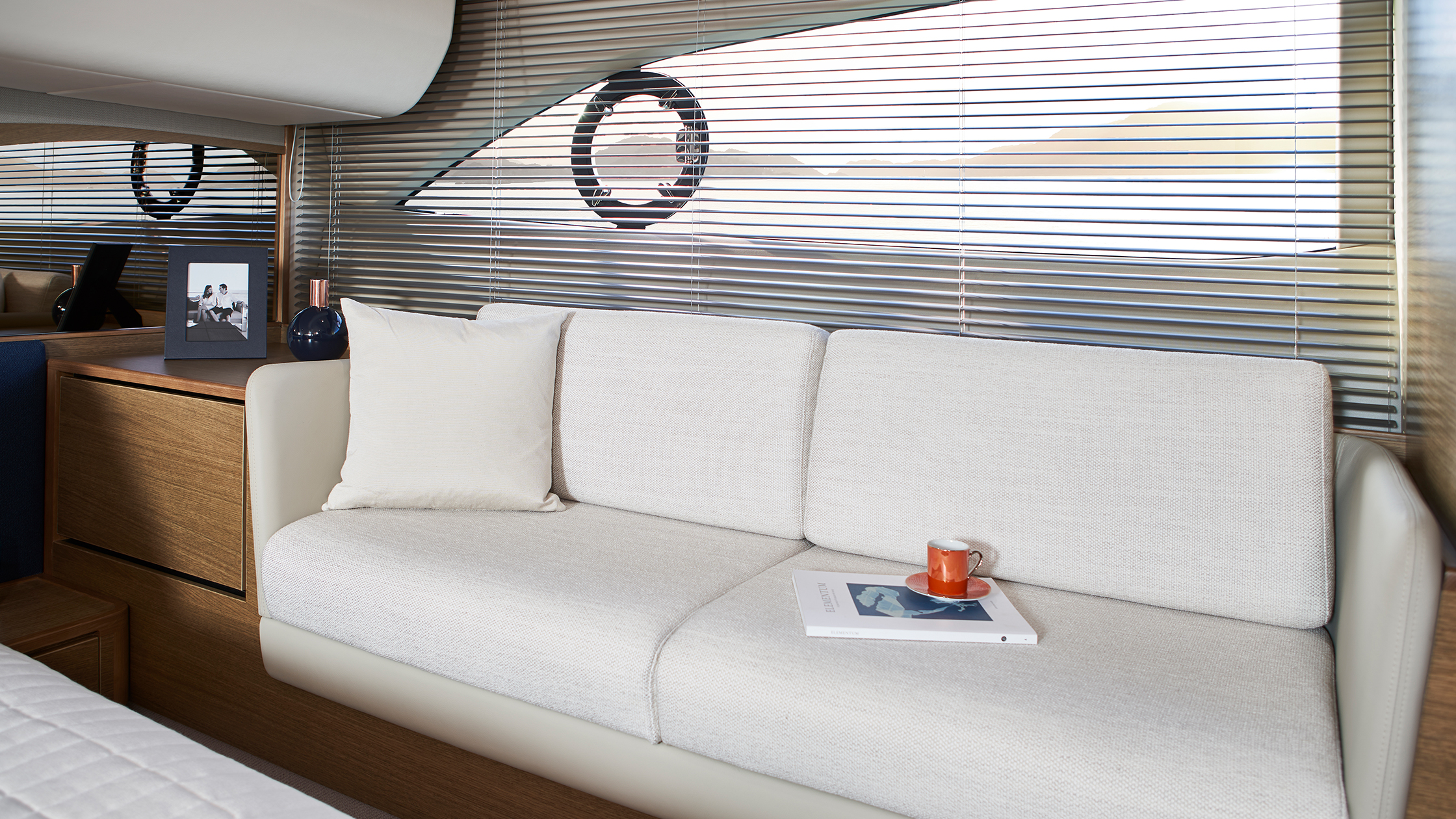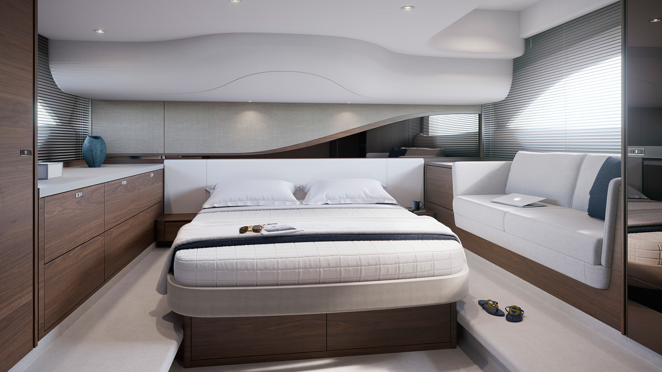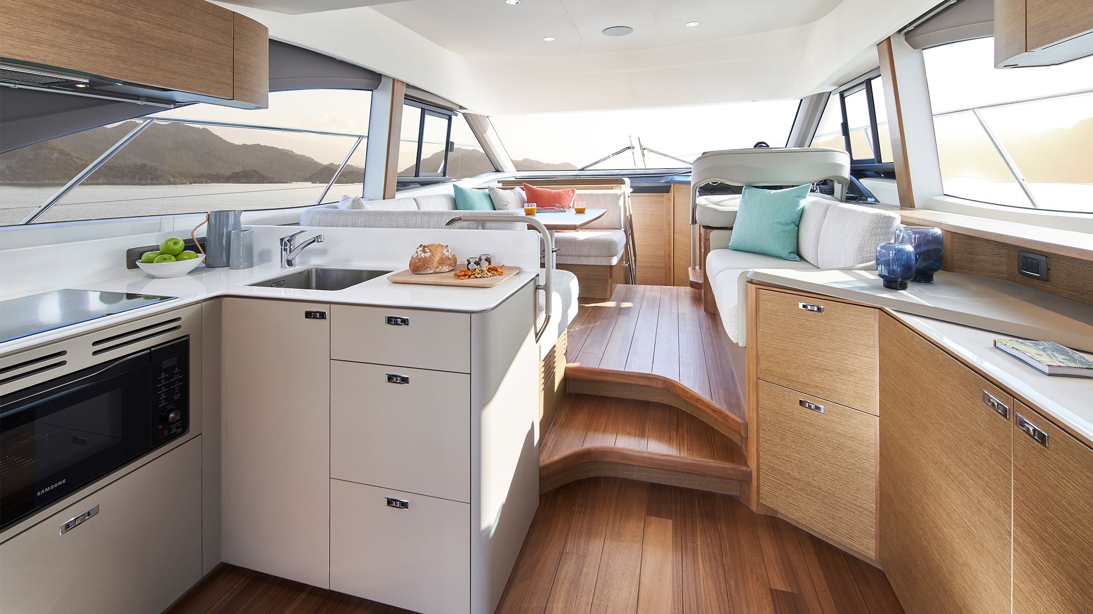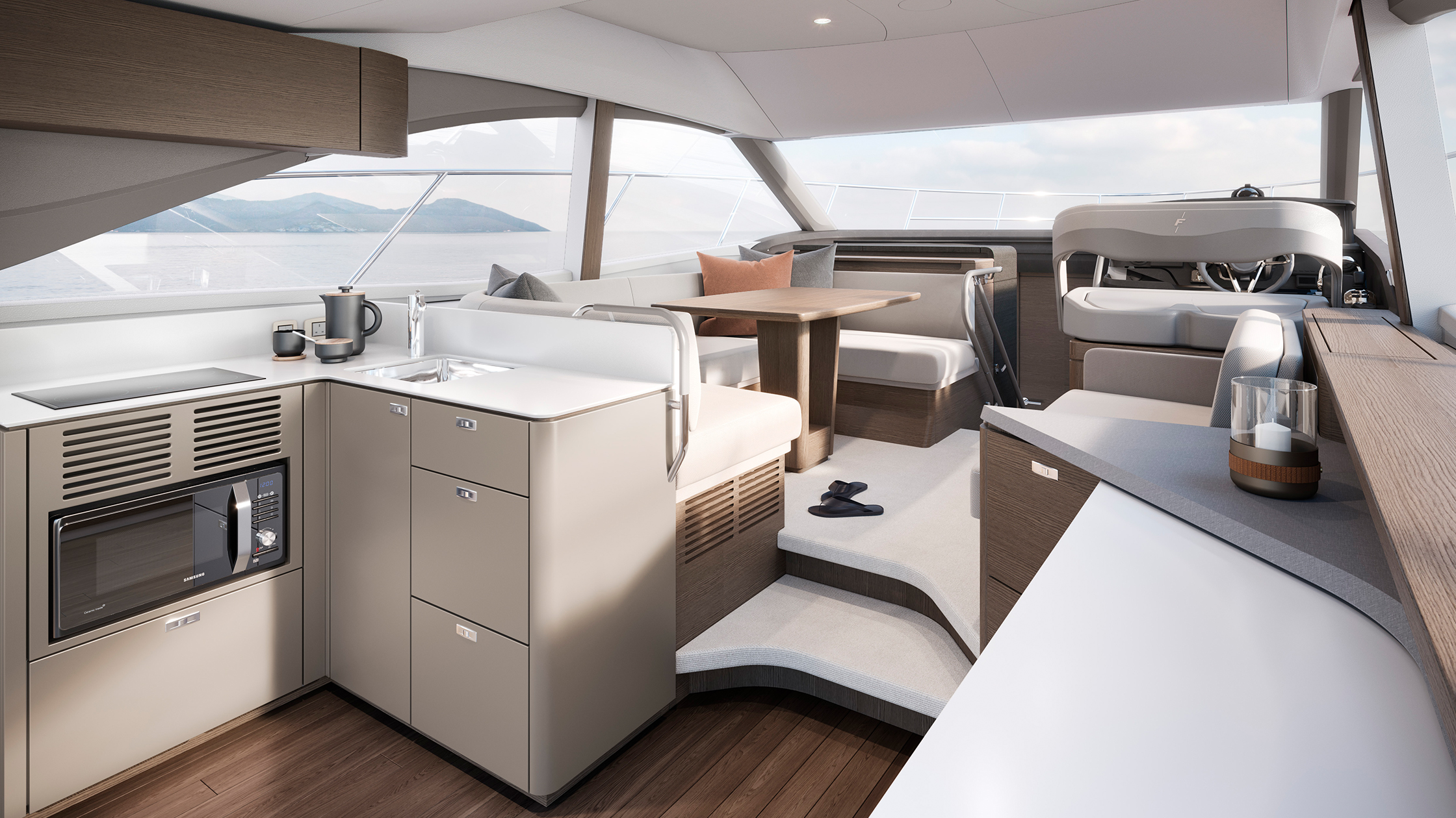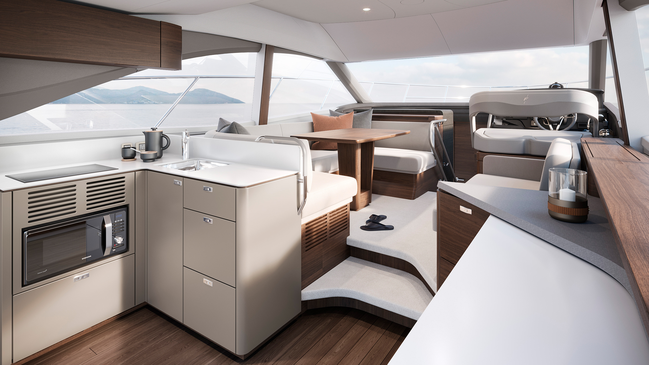 Die verlängerte Flybridge der F45 umfasst einen Sitzbereich mit einem Teakholz-Esstisch und L-förmige Sitze vorn, die sich bei Bedarf in eine Sonnenliegen umwandeln lassen. Und auf Knopfdruck lässt sich die einzigartige, elektrisch verschiebbare Sitzbank am Heckspiegel des Hauptdecks auf die gesamte Länge des Cockpitbereichs ausfahren und bietet so für eine 14,4-Meter-Yacht konkurrenzlos viel Platz.