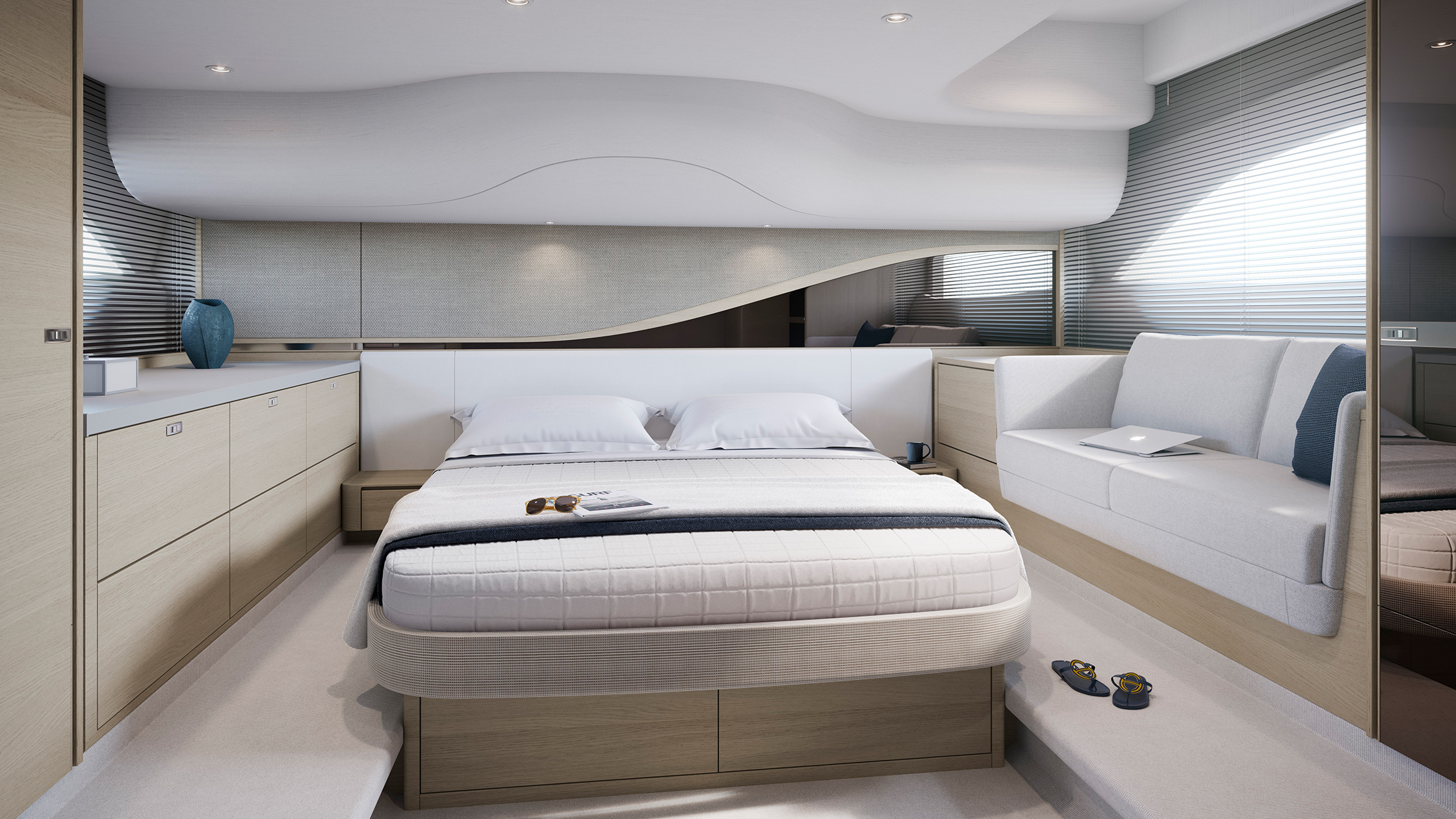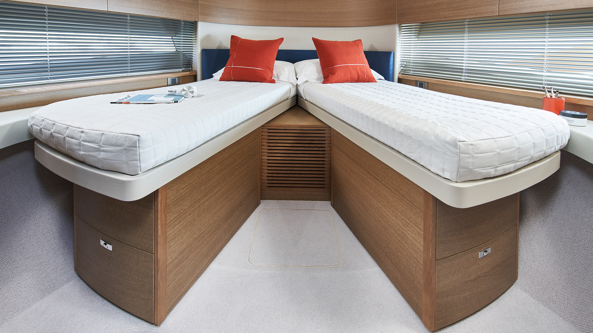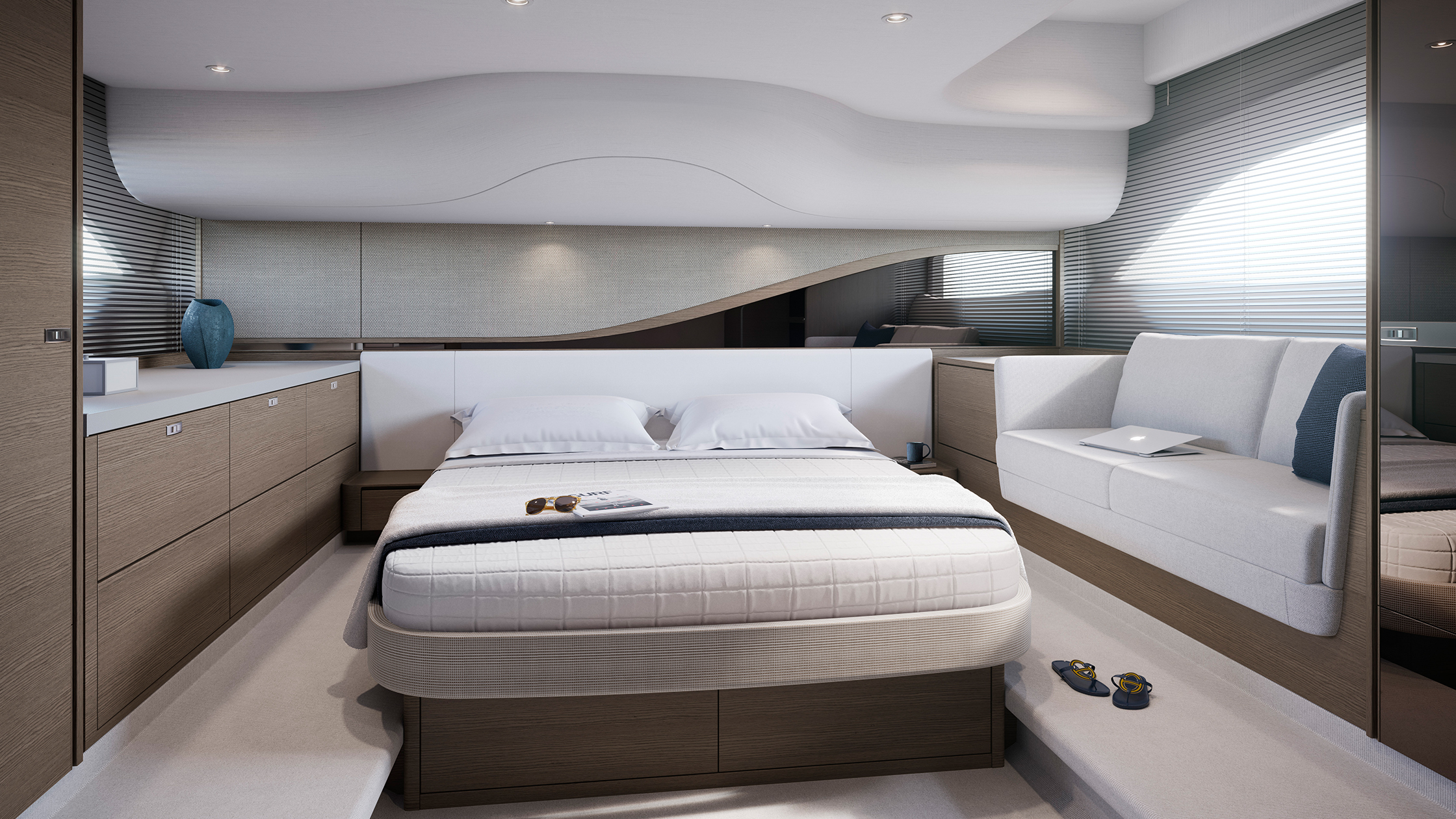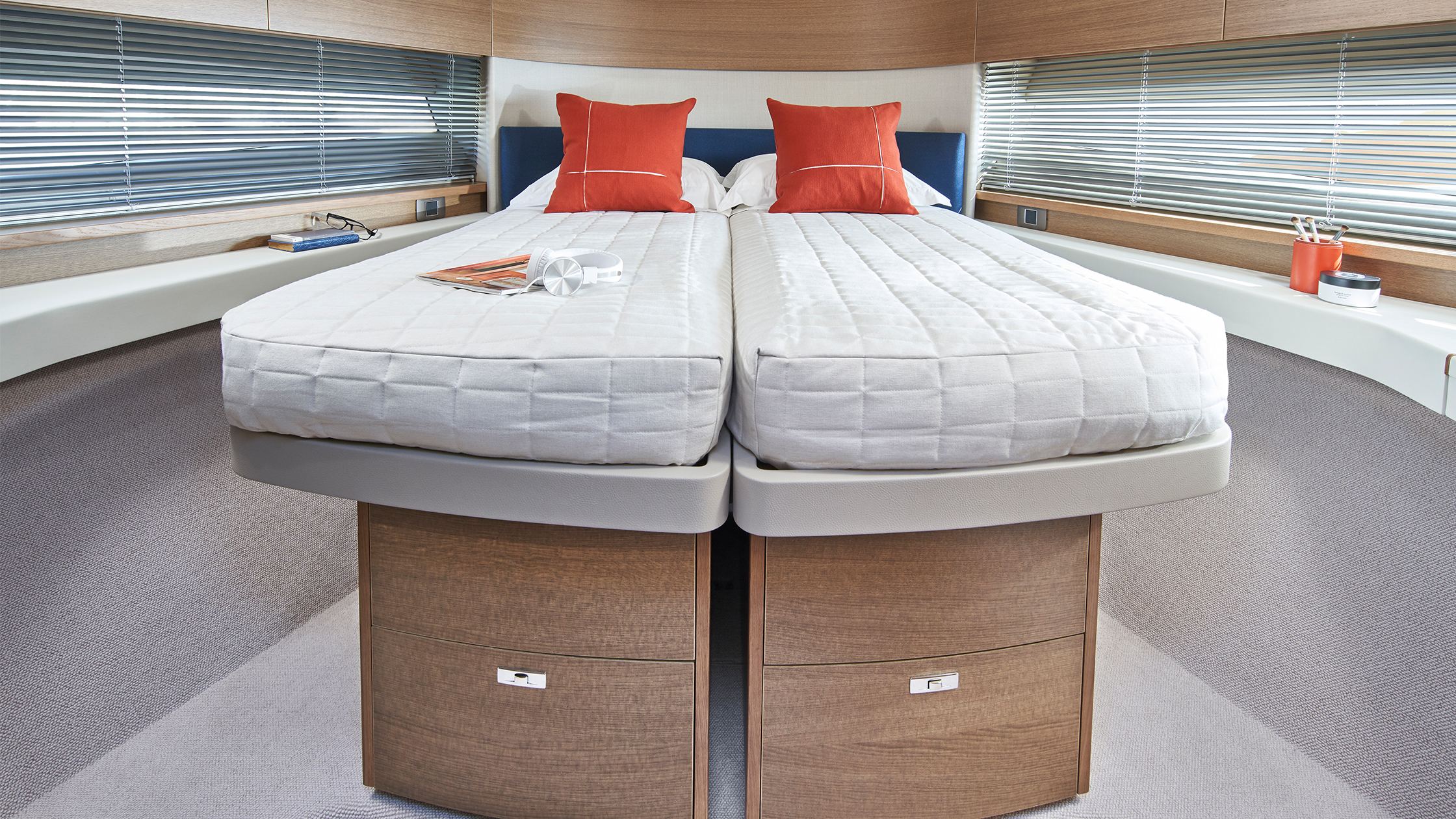 Unter Deck wird eine sich über die gesamte Bootsbreite erstreckende Eignerkabine durch eine Bugkabine mit eigenem Bad ergänzt. Damit bietet die Yacht viel mehr Platz, als ihre schlanken Proportionen vermuten lassen.