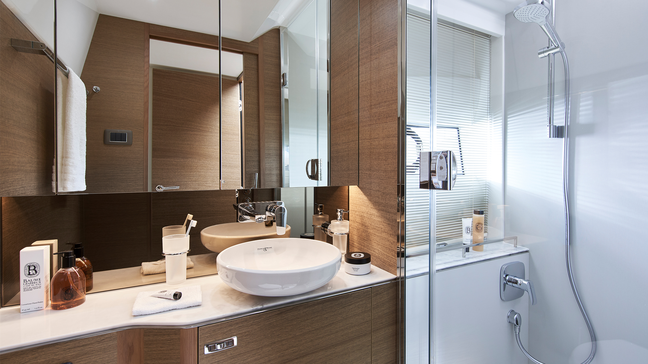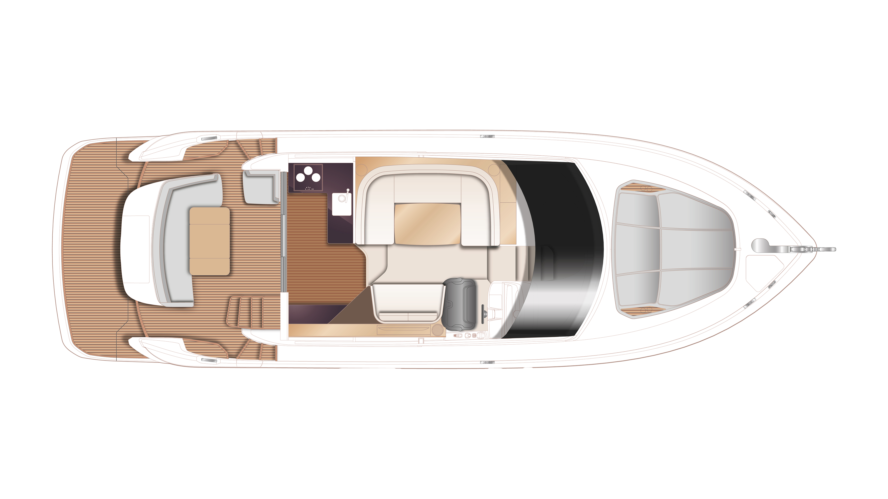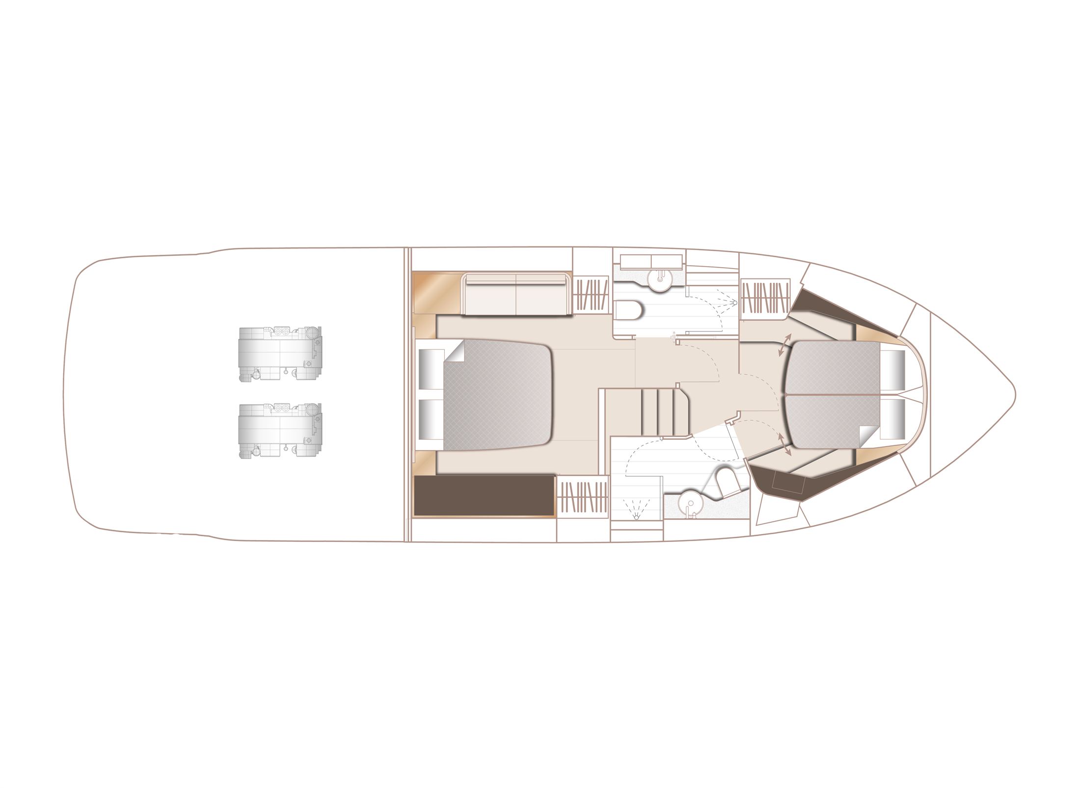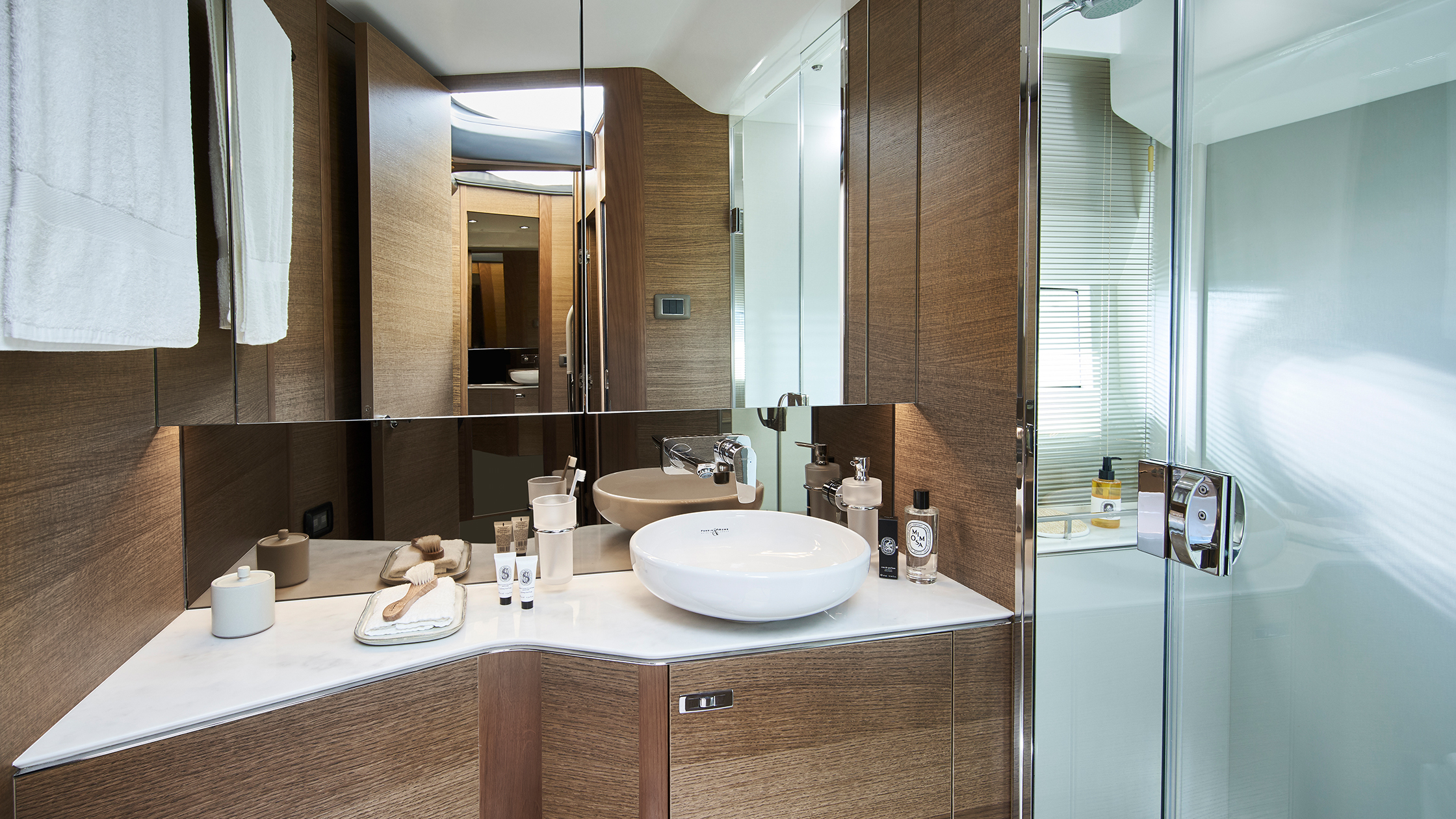Unter Deck wird eine sich über die gesamte Bootsbreite erstreckende Eignerkabine durch eine Bugkabine mit eigenem Bad ergänzt. Damit bietet die Yacht viel mehr Platz, als ihre schlanken Proportionen vermuten lassen.