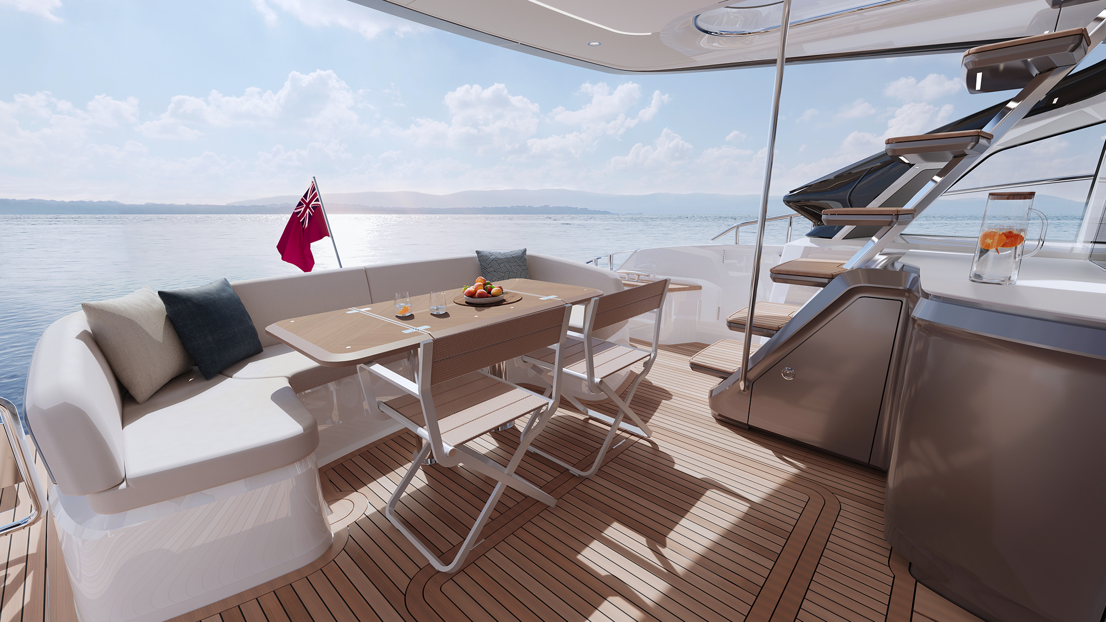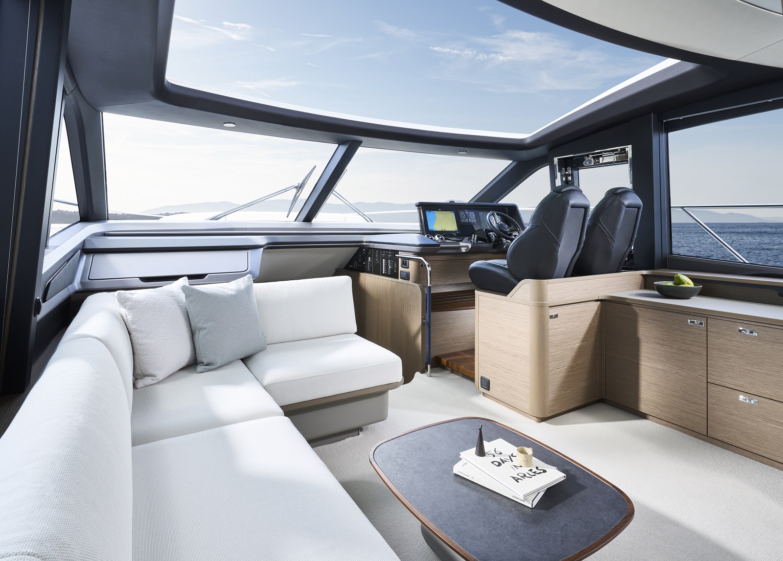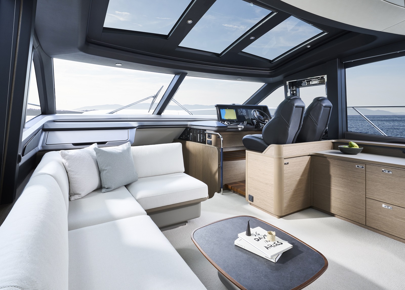 Das Hauptdeck bietet einen nahtlosen Übergang vom Außen- zum Innenbereich – mit großen umlaufenden Fenstern, Schiebetüren achtern, einem elektrisch betätigten Schiebedach und einem Cockpit, das die Nassbar mit der Kombüse verbindet.