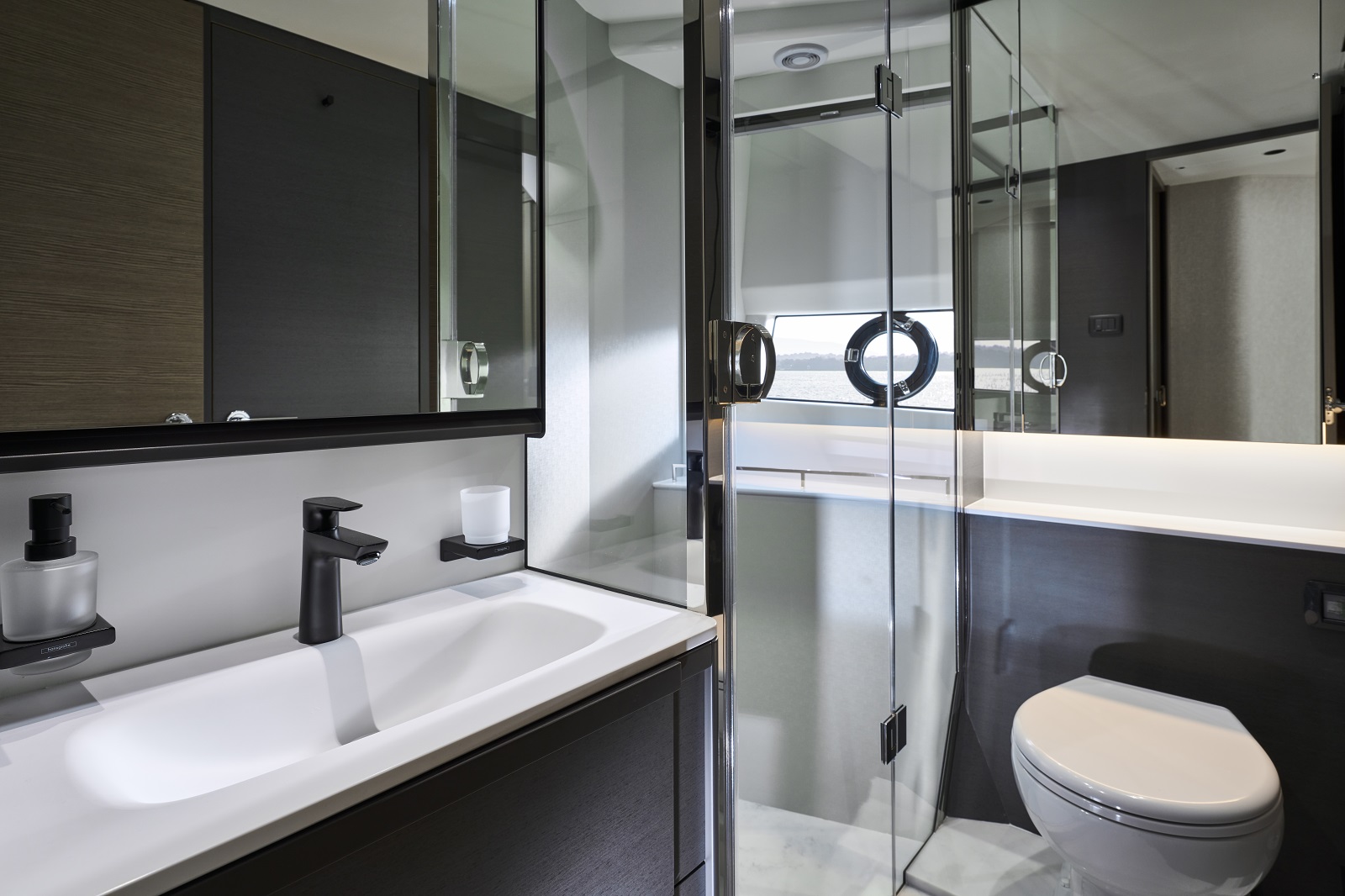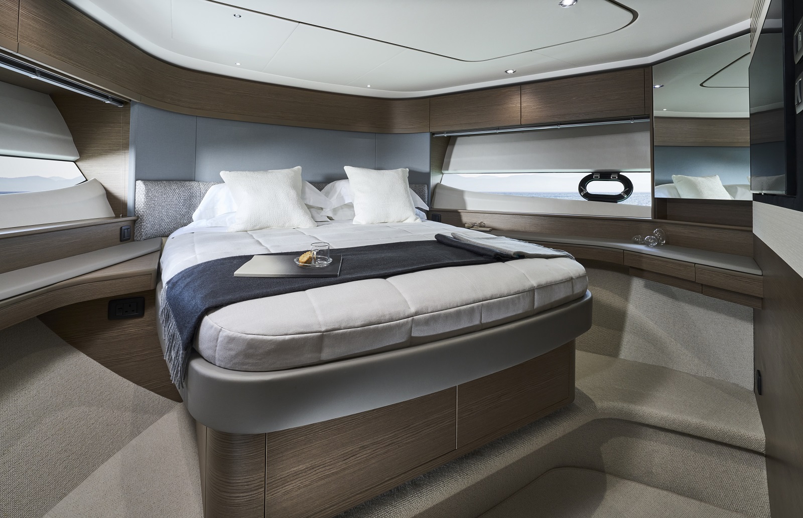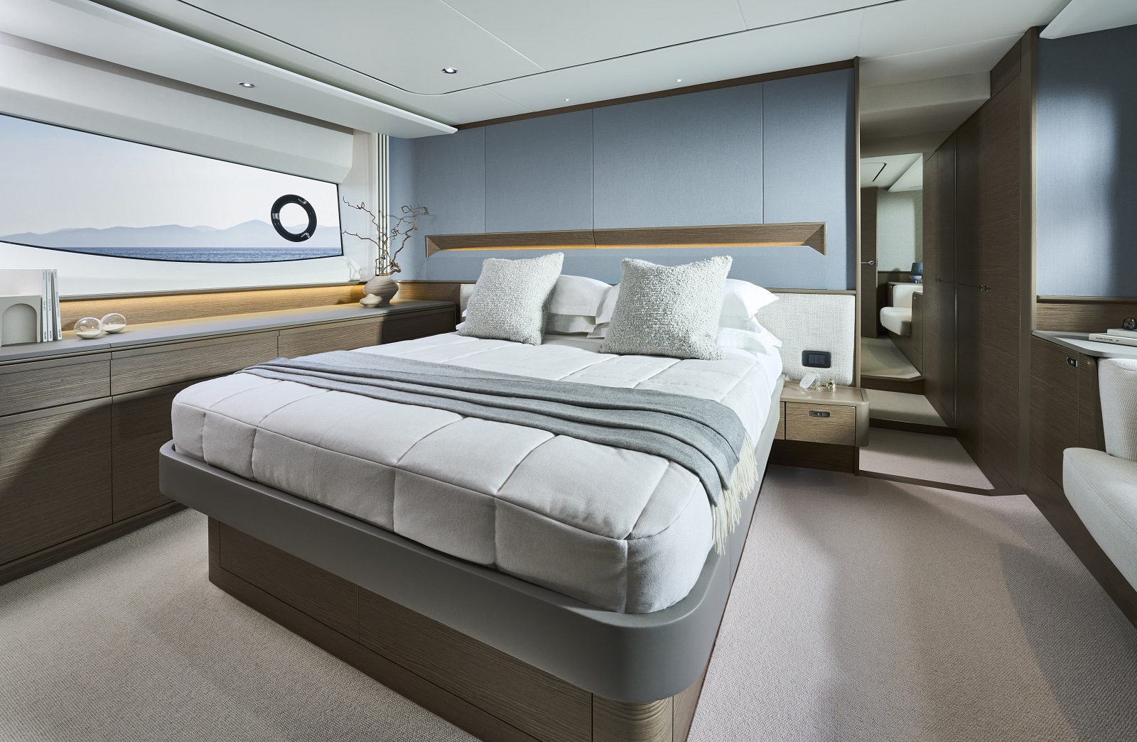 Das Hauptdeck bietet einen nahtlosen Übergang vom Außen- zum Innenbereich – mit großen umlaufenden Fenstern, Schiebetüren achtern, einem elektrisch betätigten Schiebedach und einem Cockpit, das die Nassbar mit der Kombüse verbindet.