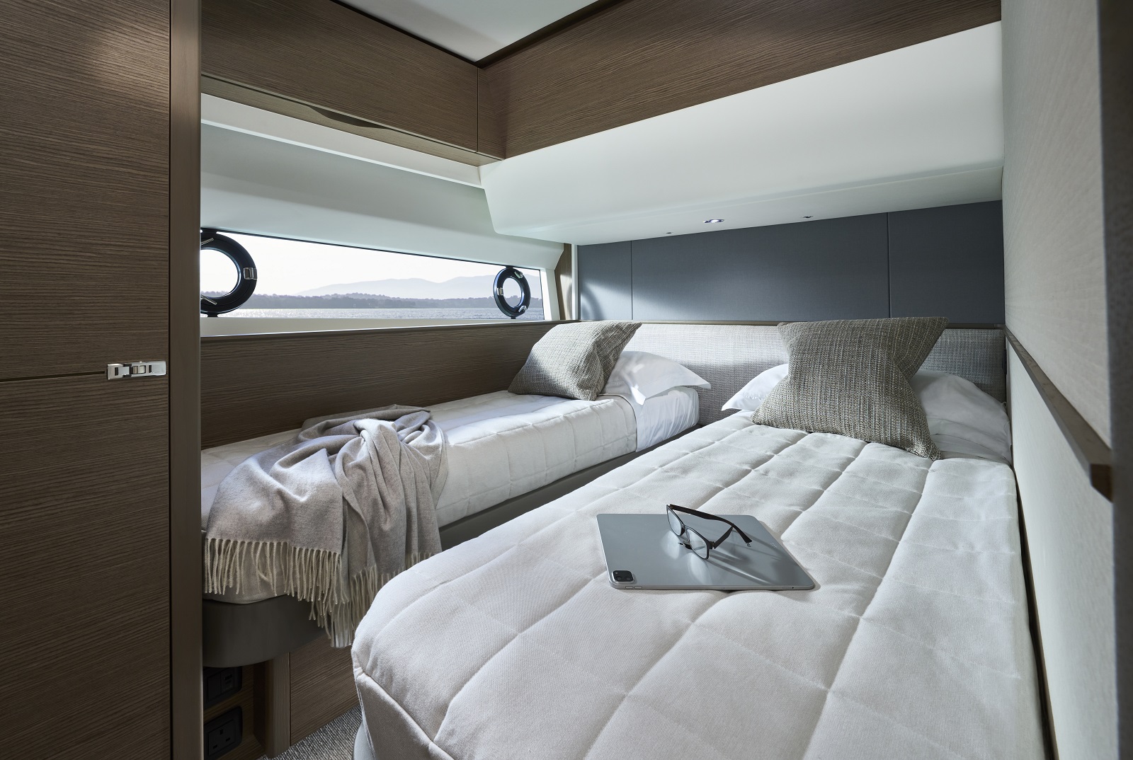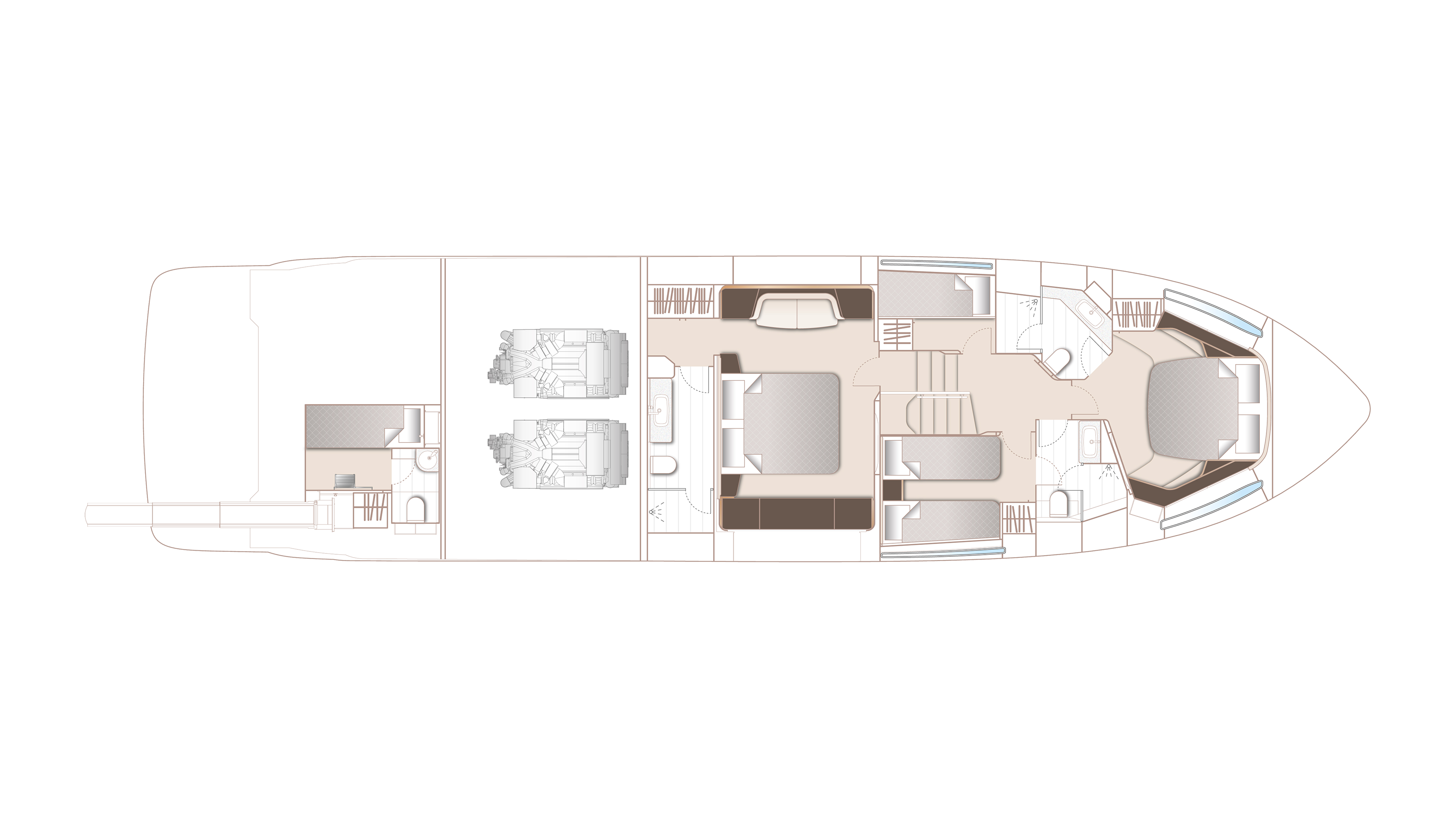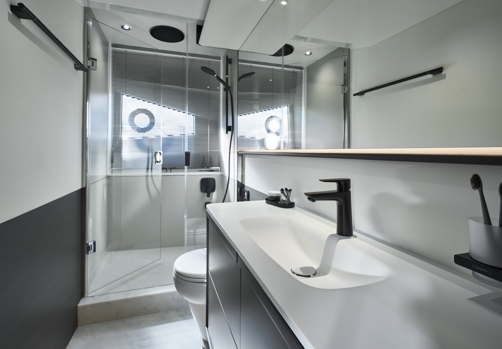 In vier Kabinen, darunter eine die ganze Bootsbreite einnehmende Eignerkabine, finden bis zu acht Personen bequem Platz. Darüber hinaus kann optional eine Mannschaftskabine mit eigenem Bad eingebaut werden.