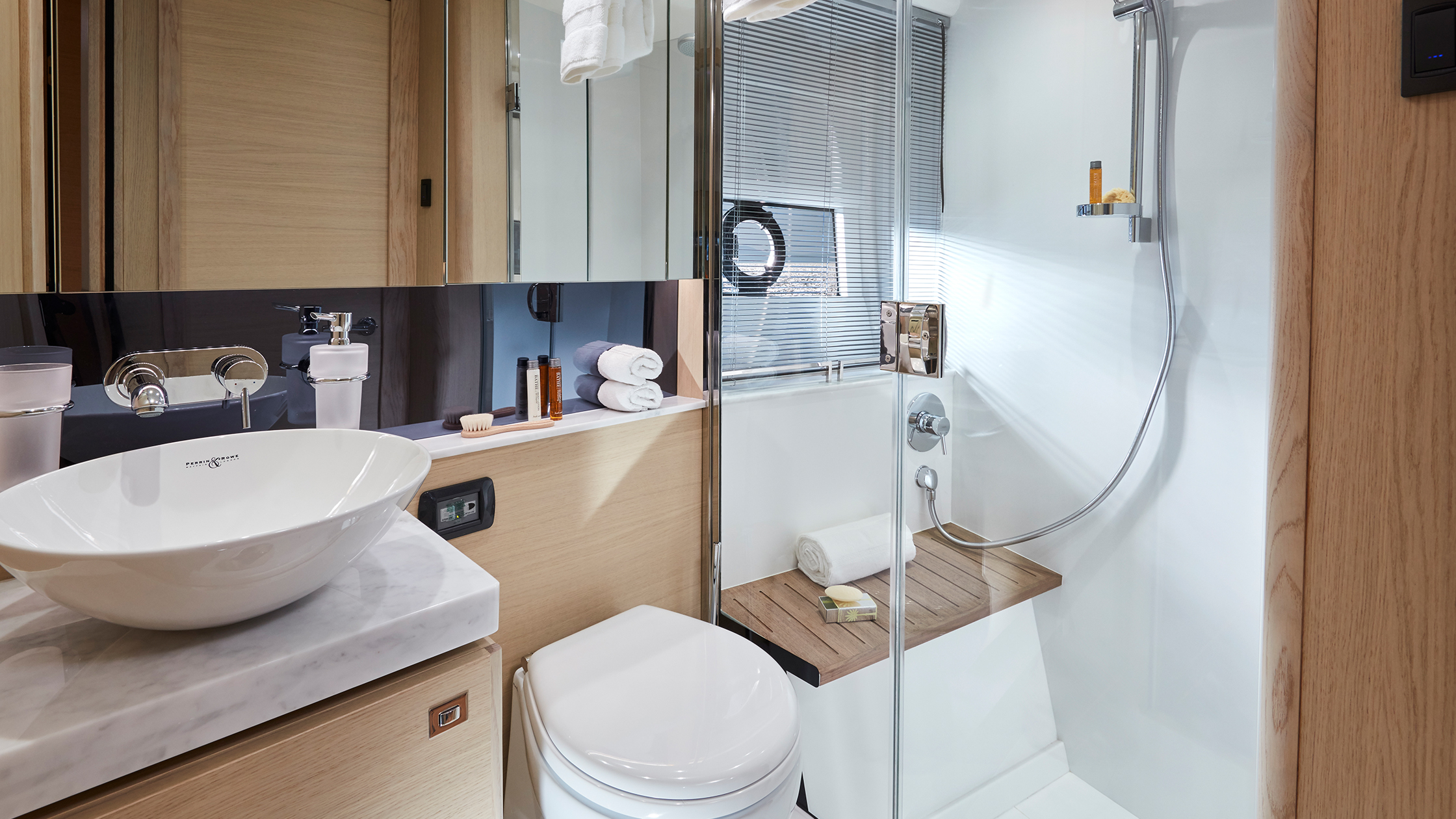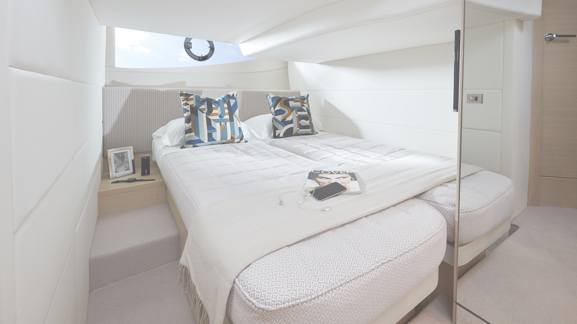 Die Vorderkabine verfügt über ein eigenes Bad mit zweitem Zugang zum Salon, während die Achterkabine wahlweise mit Schiebekojen ausgestattet werden kann, die sich bei Bedarf mühelos zu einem Doppelbett umbauen lassen.