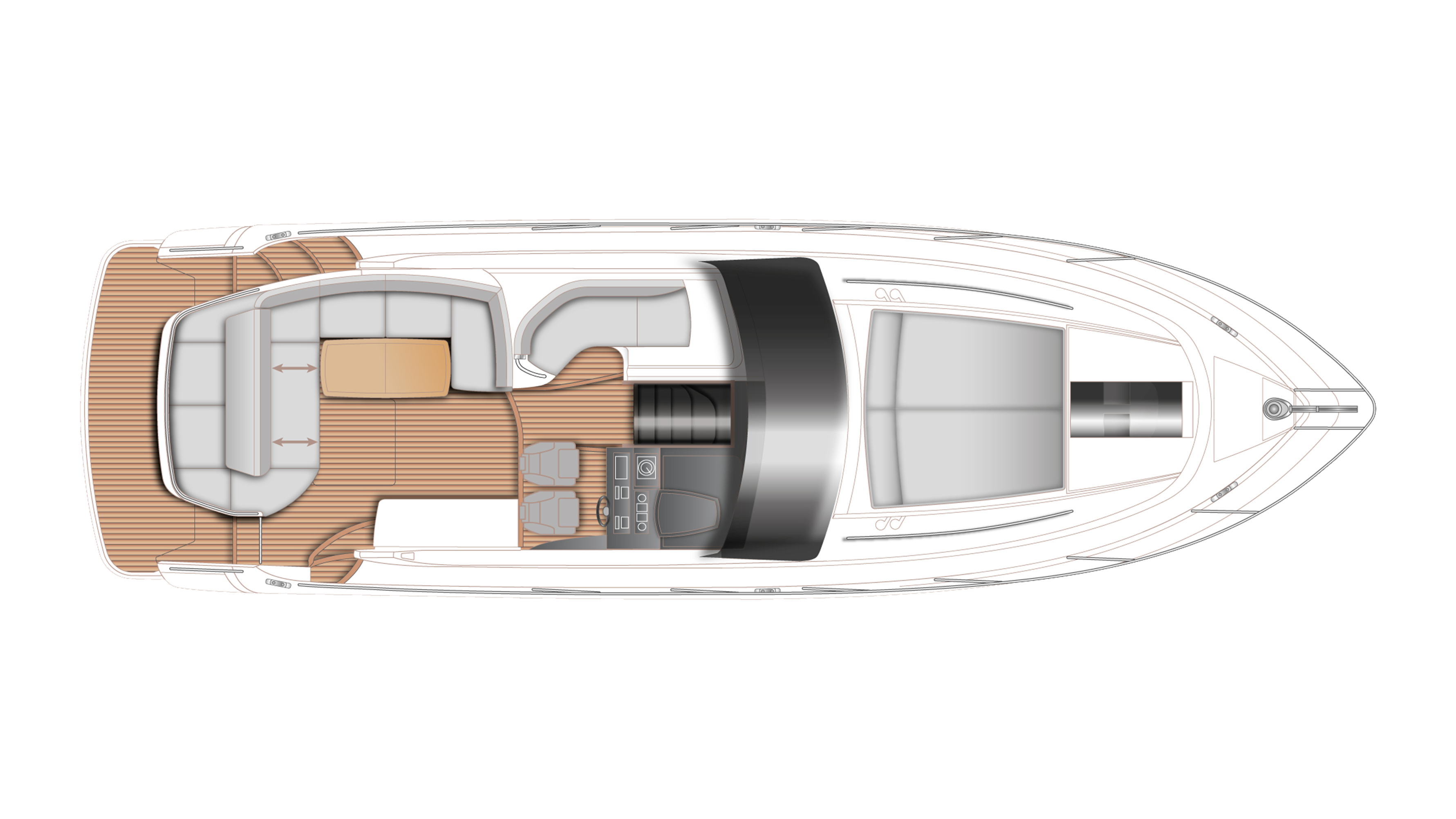 Auf dem Hauptdeck bietet das großzügige Cockpit mit gut ausgestatteter Nassbar einen idealen Rahmen für unvergessliche Momente in geselliger Runde. Wahlweise kann achtern eine zusätzliche, wandelbare Sonnenliege konfiguriert werden.