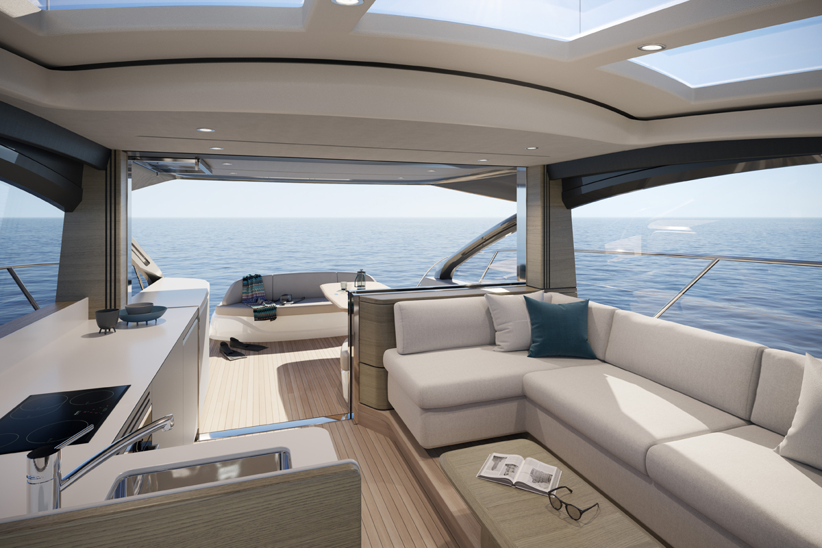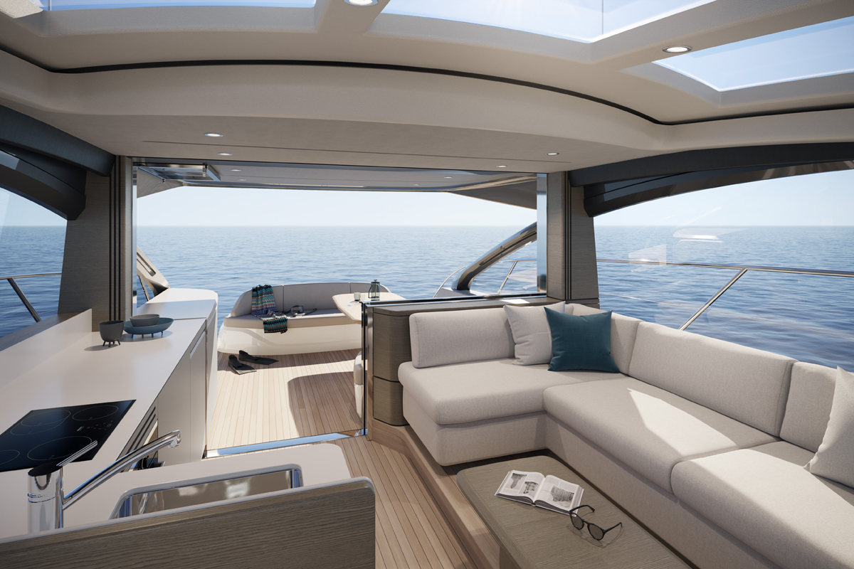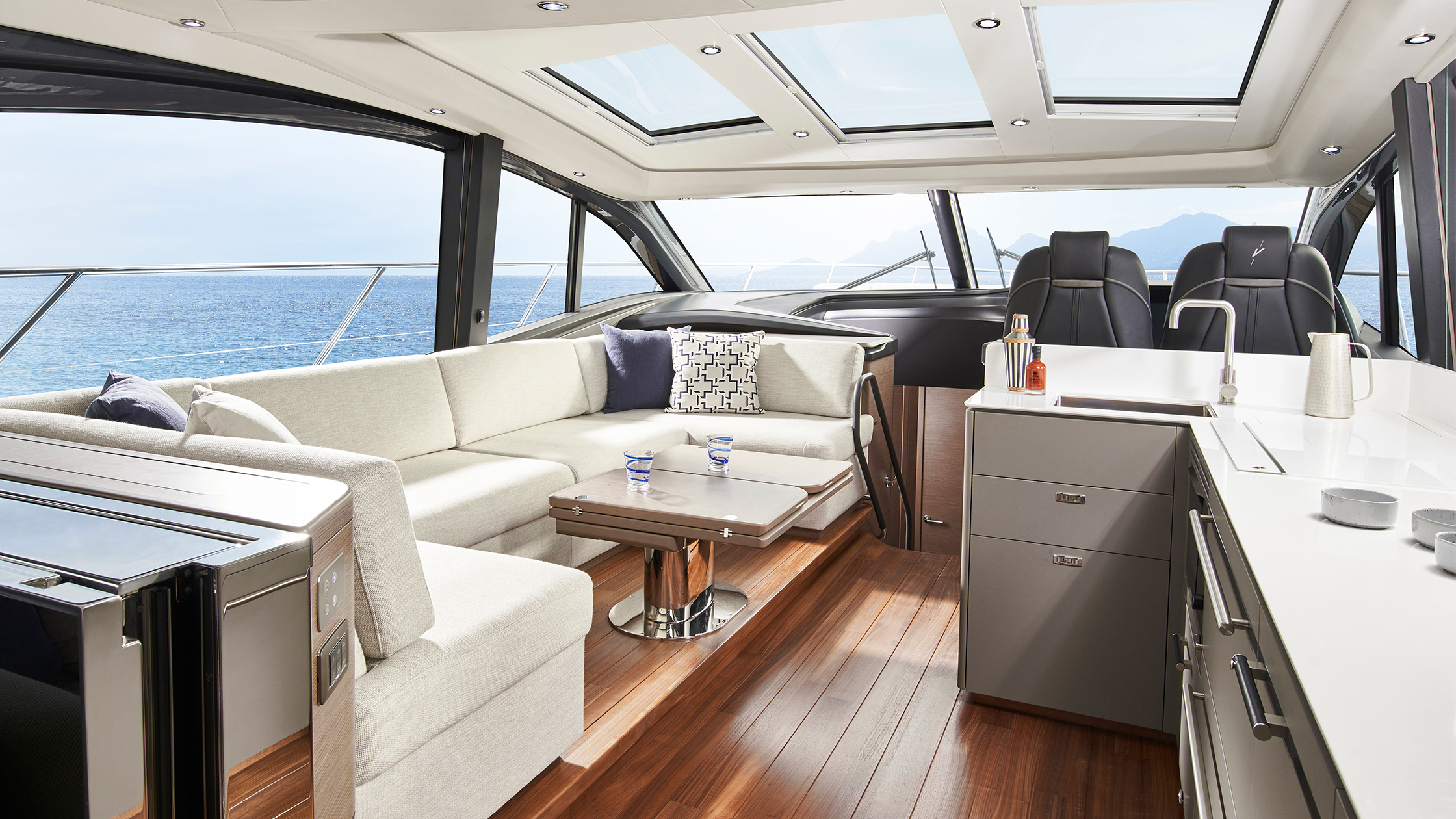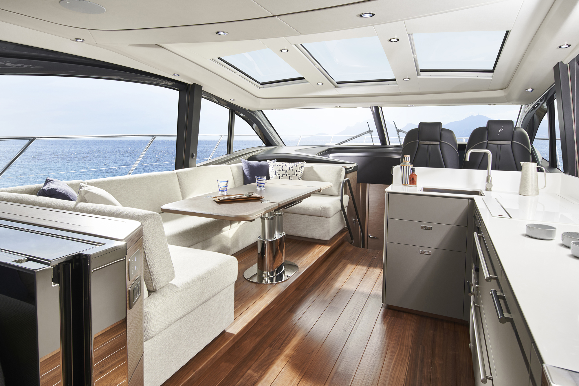 Das Hauptdeck der V55 wurde speziell für diejenigen konzipiert, die sich für offene Boote begeistern. Das großzügige Cockpit verfügt über einen großen L-förmigen Sitzbereich mit zusätzlichen Sitzgelegenheiten achtern rund um einen großen, klappbaren Teaktisch zum Genuss der Köstlichkeiten aus der Nassbar mit elektrischem Grill.