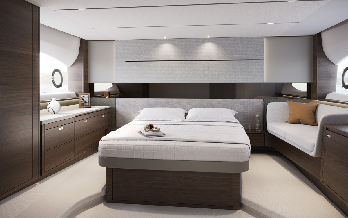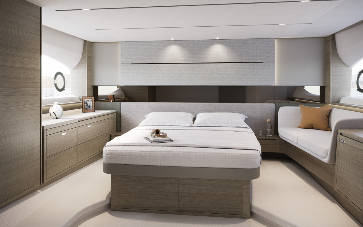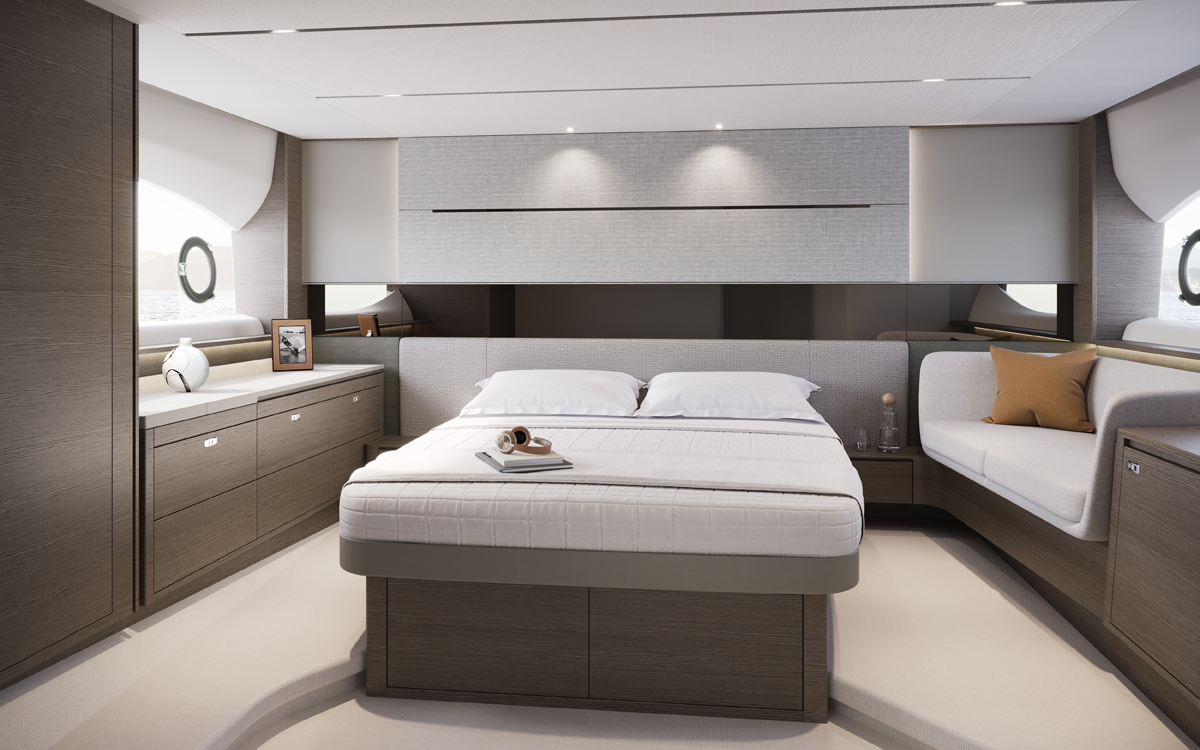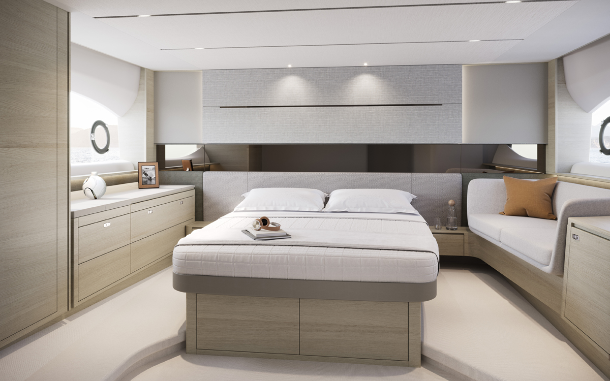 Darüber hinaus befinden sich auf dem Hauptdeck eine große Sonnenliege hinterm Cockpit sowie ein Sitz- und Sonnenbereich auf dem Vorschiff. Und dank einer Höchstgeschwindigkeit von 35 Knoten können Sie eine sportliche Fahrweise genießen.