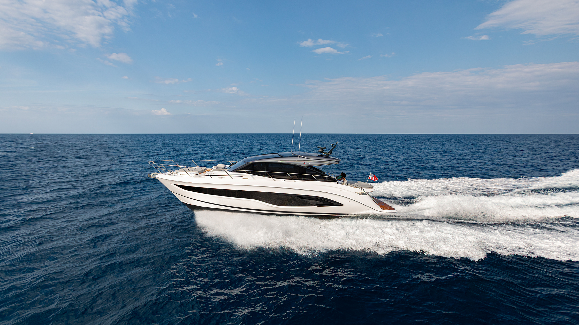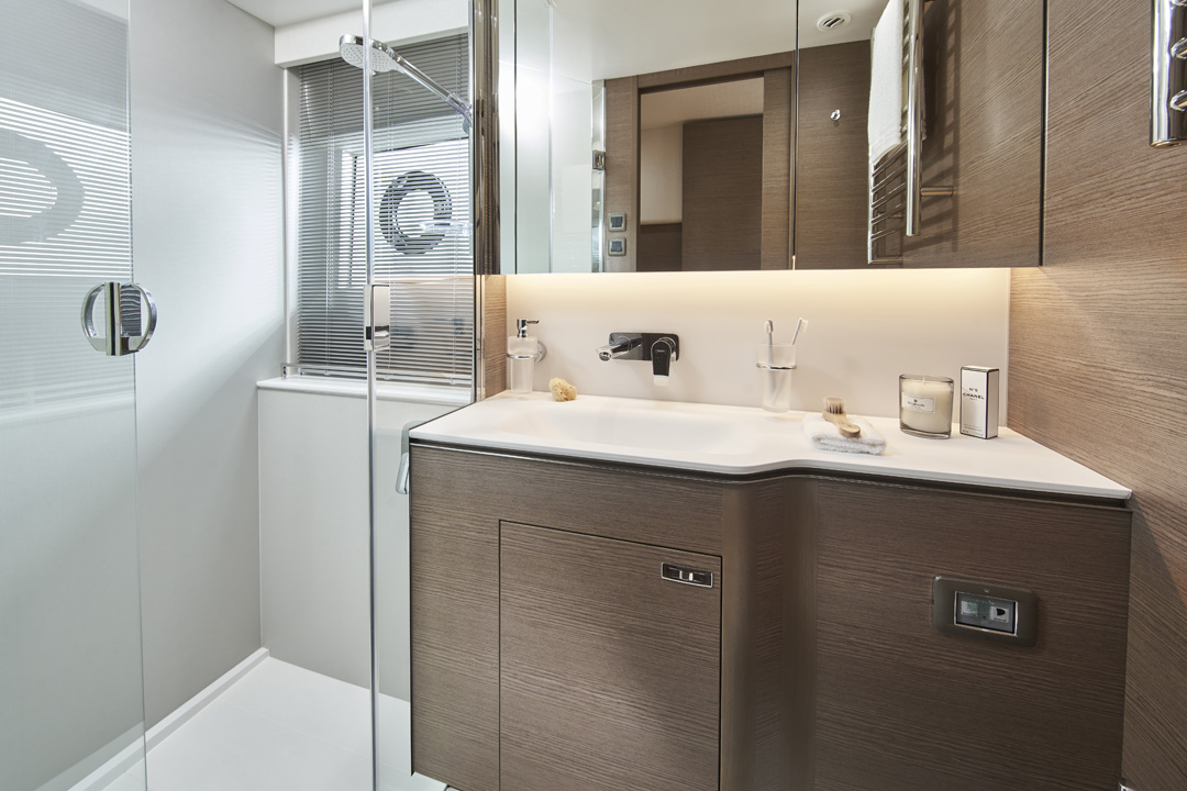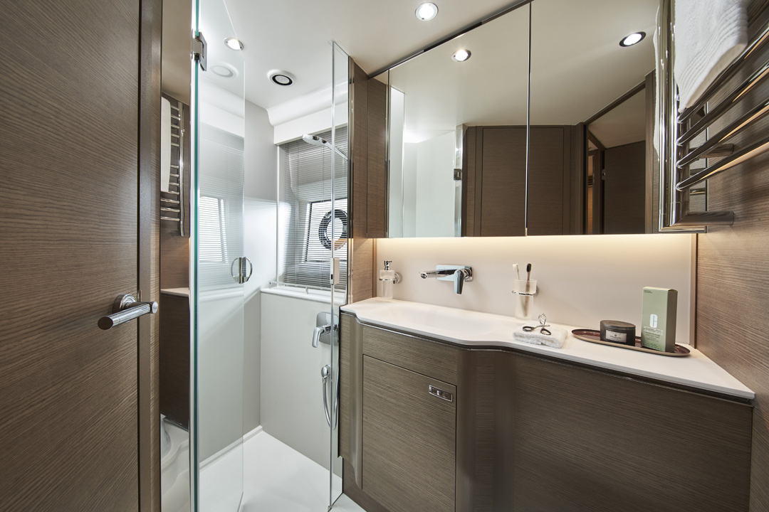 Darüber hinaus befinden sich auf dem Hauptdeck eine große Sonnenliege hinterm Cockpit sowie ein Sitz- und Sonnenbereich auf dem Vorschiff. Und dank einer Höchstgeschwindigkeit von 35 Knoten können Sie eine sportliche Fahrweise genießen.