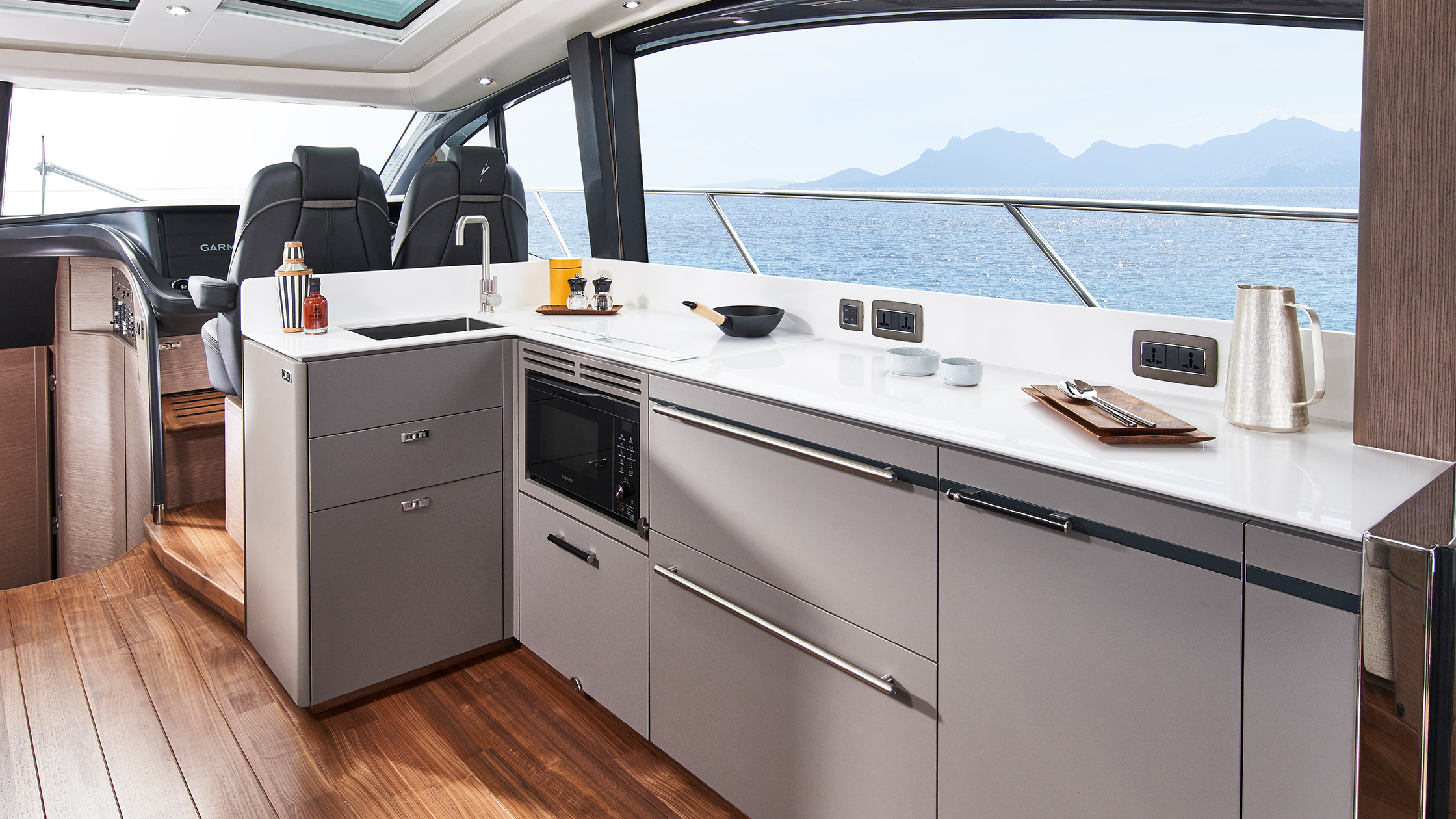 Eine versenkbare Schiebetür mit zu öffnendem Fenster hinter der Kombüse verbindet diesen Bereich mit dem Salon. So lassen sich die beiden Bereiche nach Bedarf nahtlos miteinander verbinden.