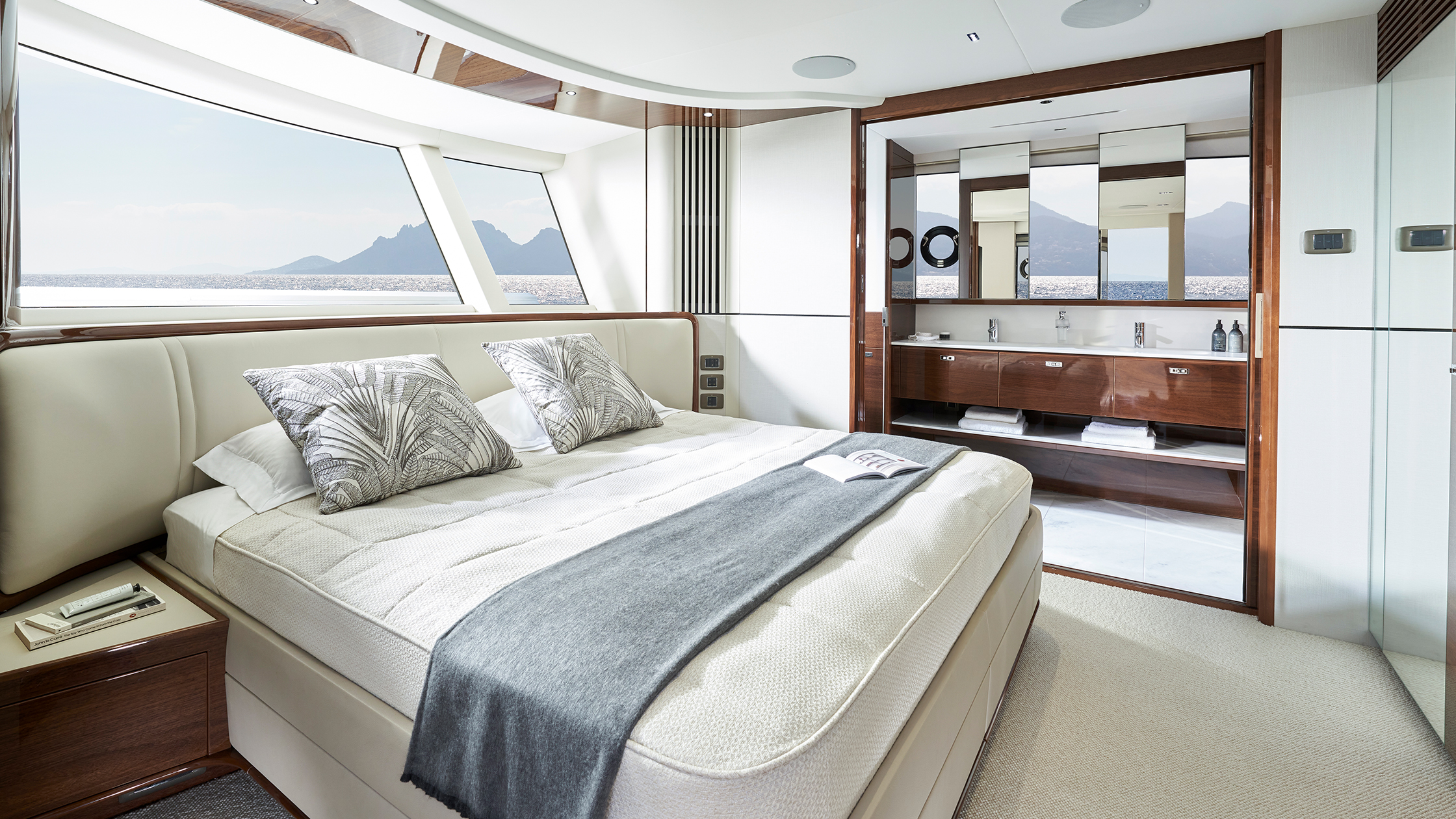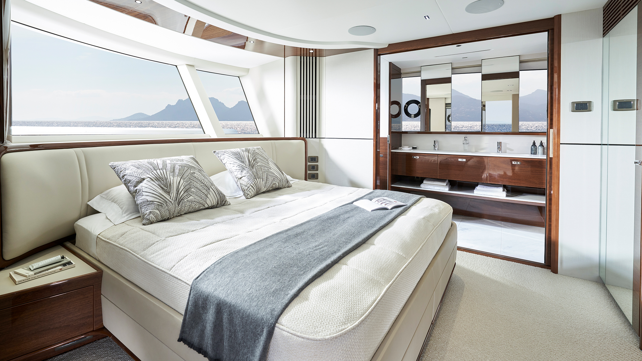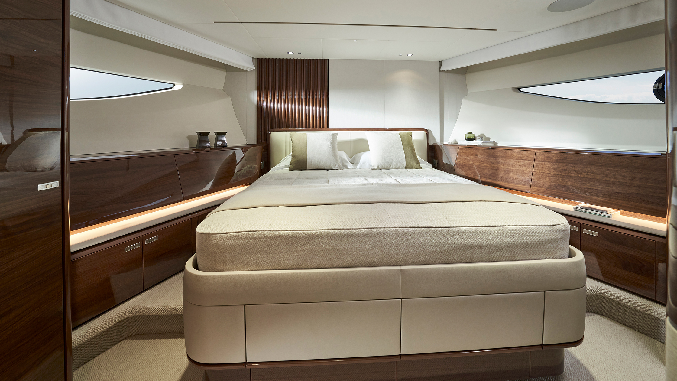 Viel Licht und innovatives Design warten auch unter Deck, wo acht Personen in vier Kabinen mit eigenem Bad Platz finden: eine mittschiffs gelegene, sich über die gesamte Bootsbreite erstreckende Eignerkabine, eine Gästekabine im Bug, eine Doppelbettkabine an Steuerbord und eine an Backbord. Hinter den Hauptkabinen befindet sich der Mannschaftsraum, der in der Standardauslegung Platz für drei Personen bietet.