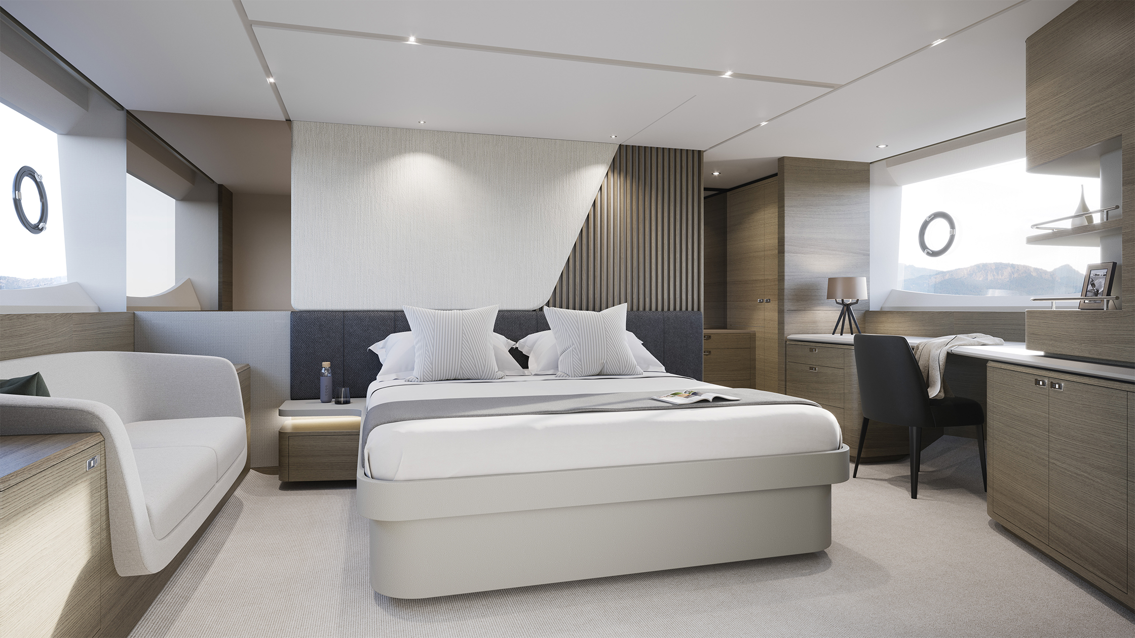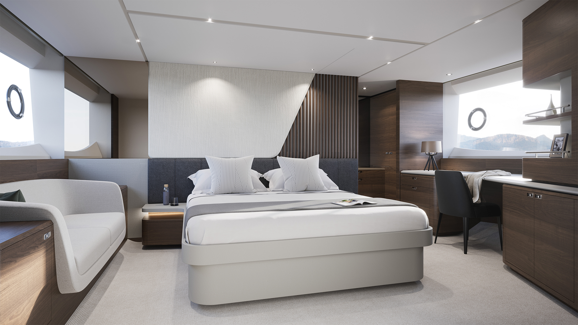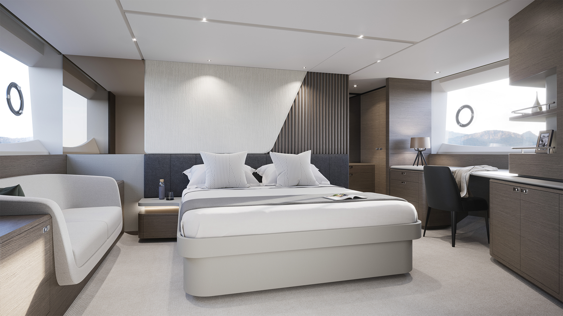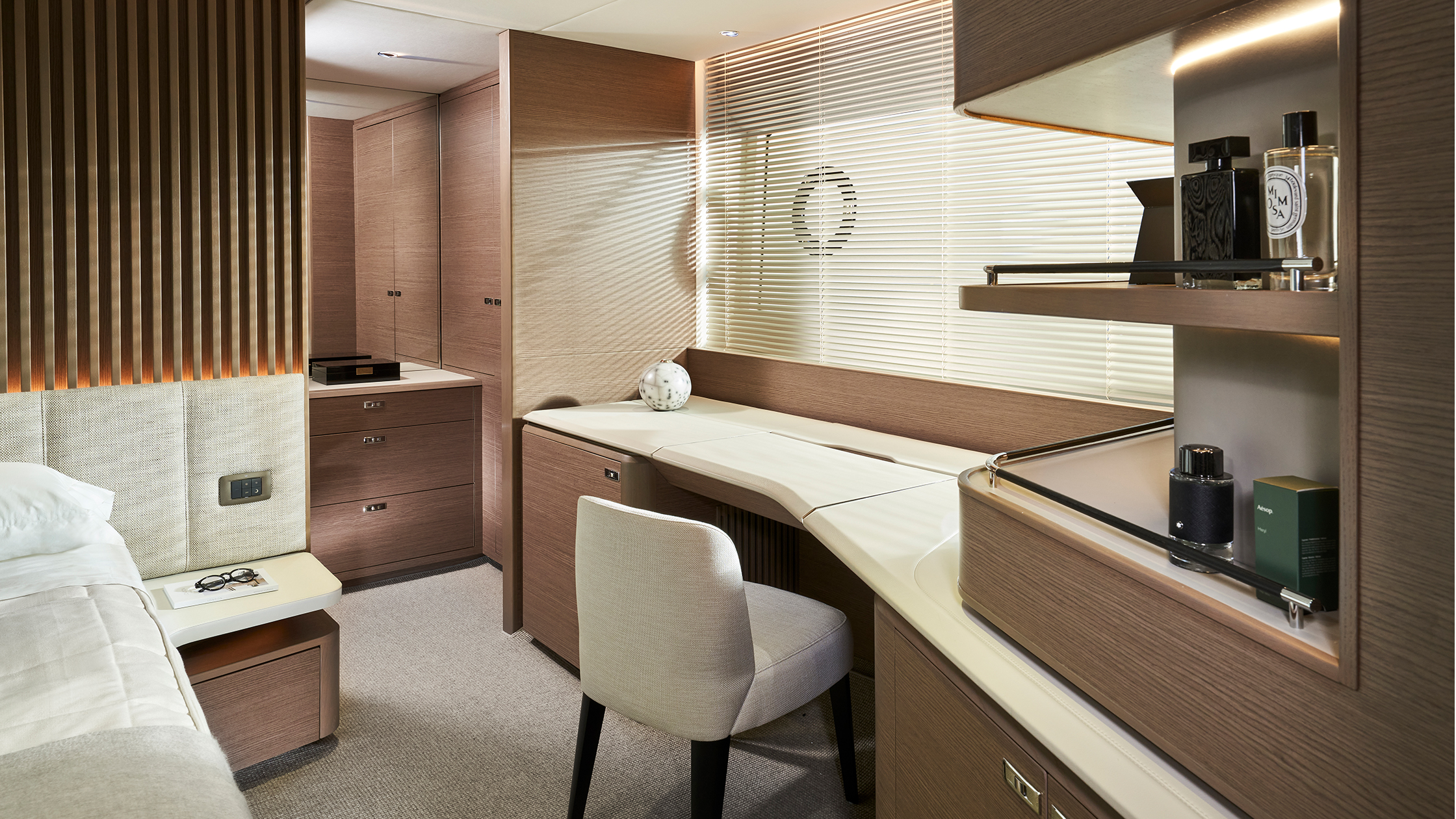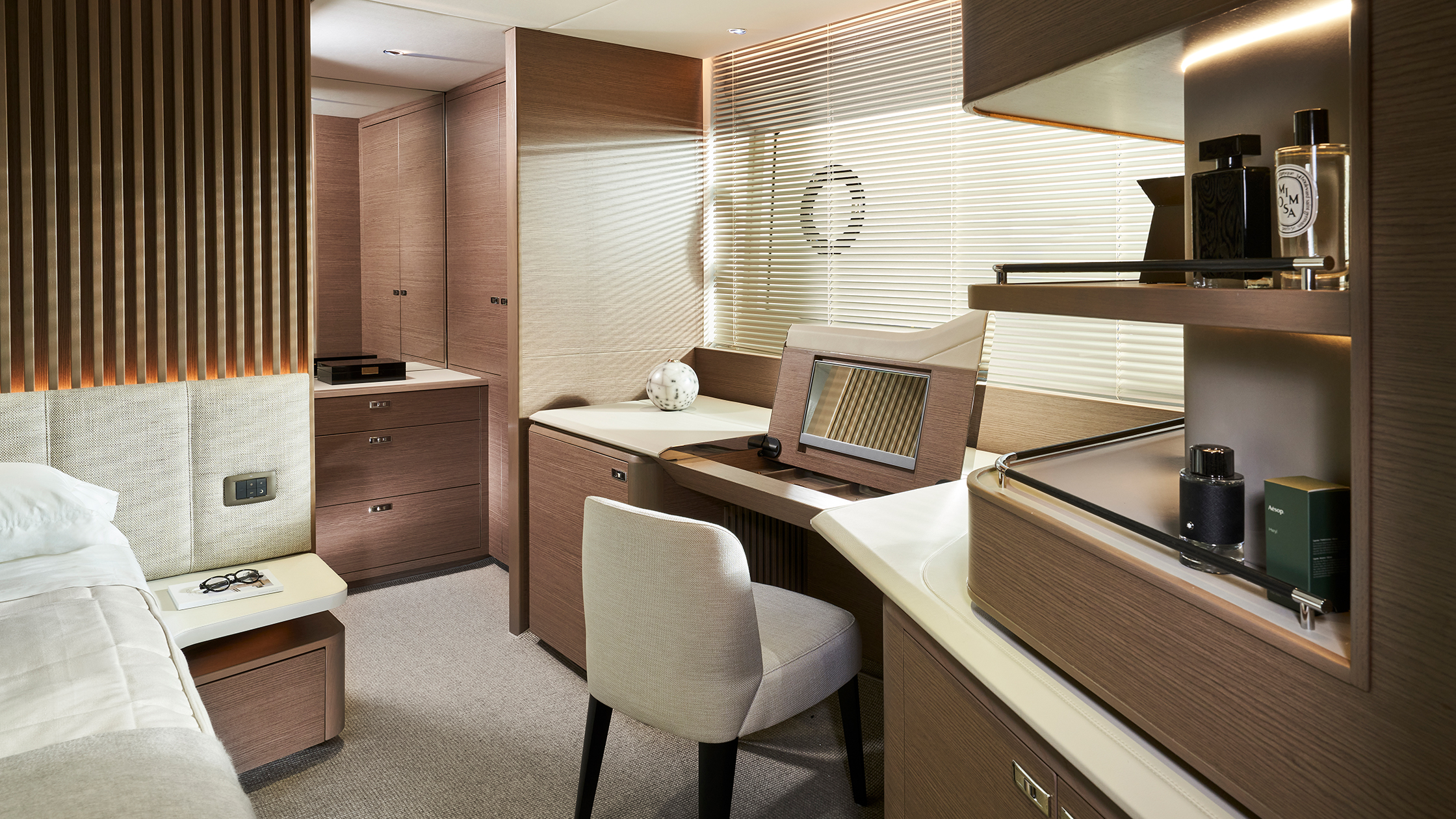 Die Eignerkabine, die die ganze Bootsbreite einnimmt, präsentiert sich besonders edel. Dafür sorgen architektonisch inspirierte Wandtafeln, frisch wirkende Leinentapeten, ein bronzefarbener Spiegel und ein mit Livorno Stone-Leder bezogener Schminktisch. Eine eigene Treppe führt über einen privaten, mit dem Salon verbundenen Lobbybereich zum Hauptdeck.