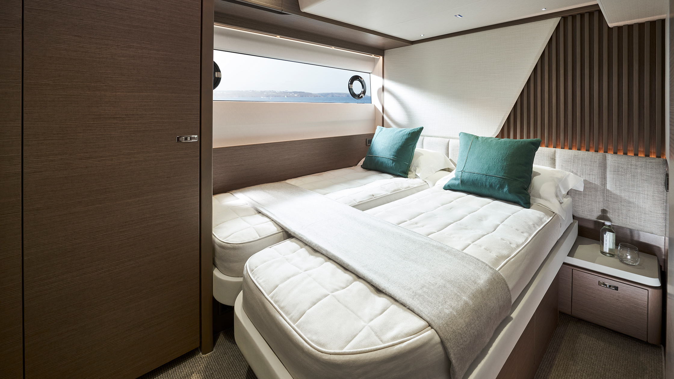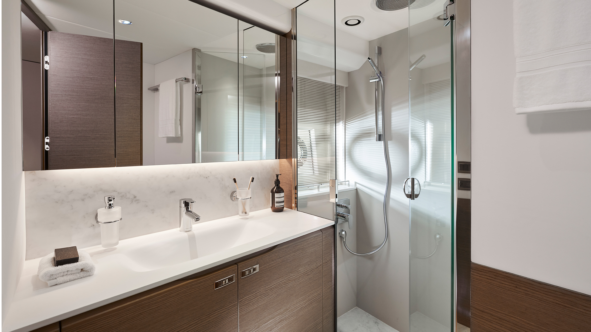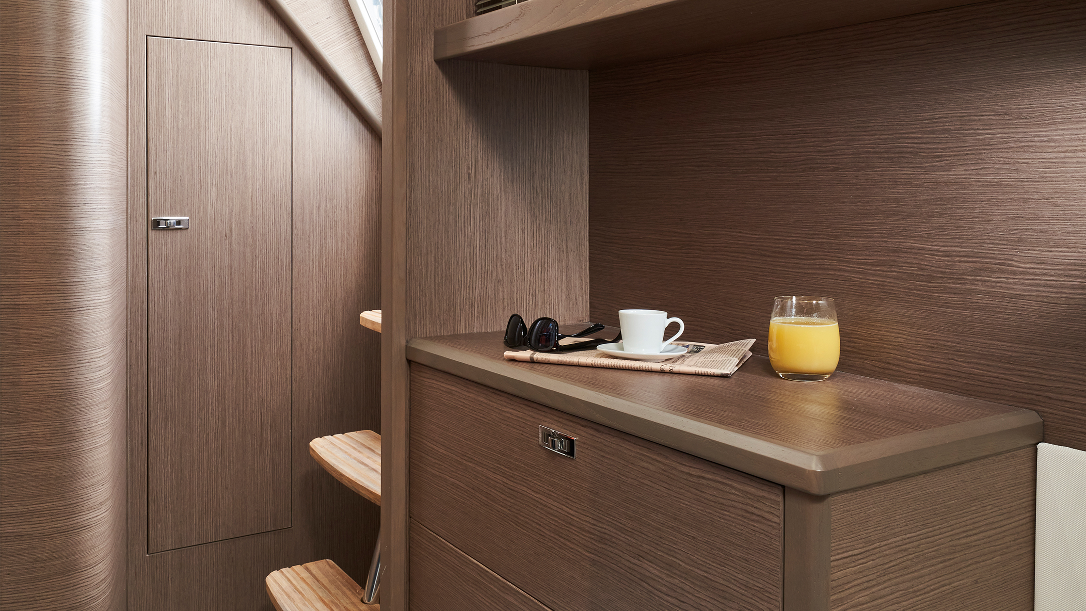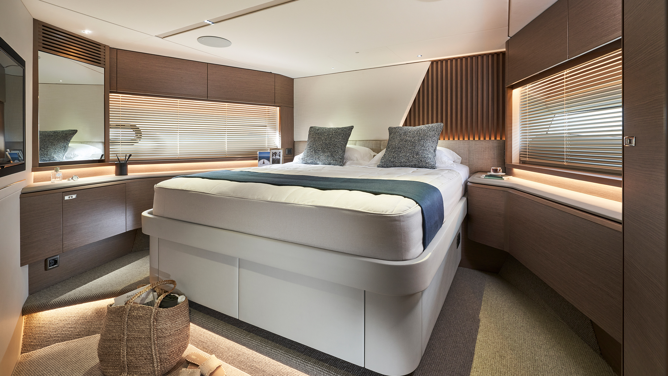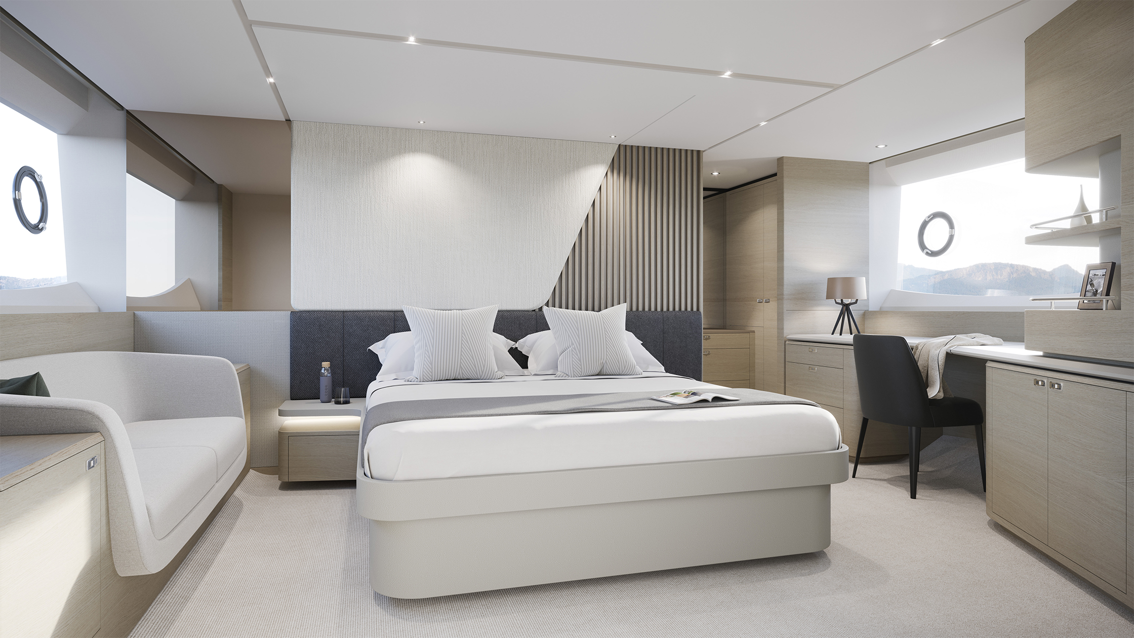 Die Eignerkabine, die die ganze Bootsbreite einnimmt, präsentiert sich besonders edel. Dafür sorgen architektonisch inspirierte Wandtafeln, frisch wirkende Leinentapeten, ein bronzefarbener Spiegel und ein mit Livorno Stone-Leder bezogener Schminktisch. Eine eigene Treppe führt über einen privaten, mit dem Salon verbundenen Lobbybereich zum Hauptdeck.