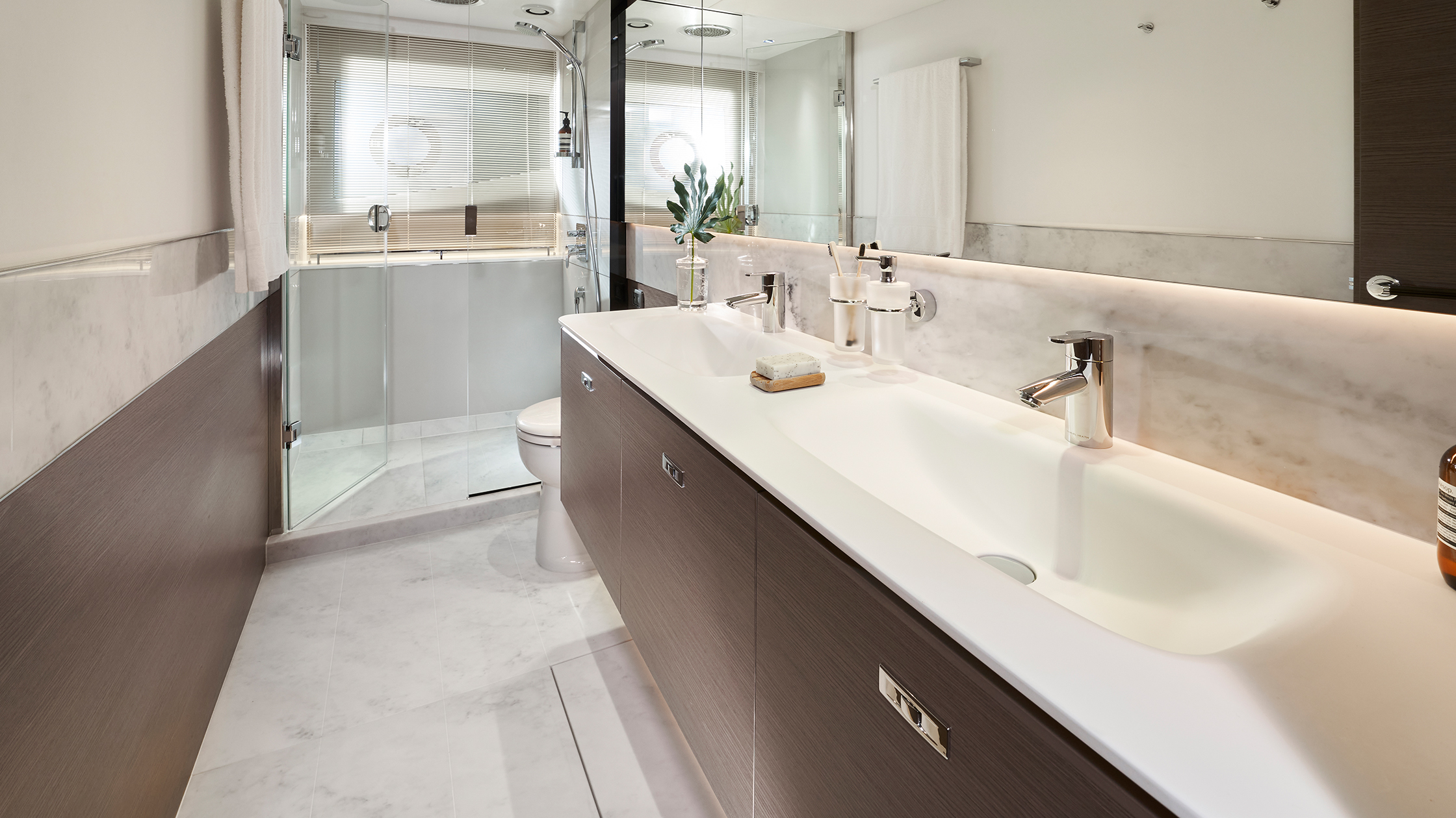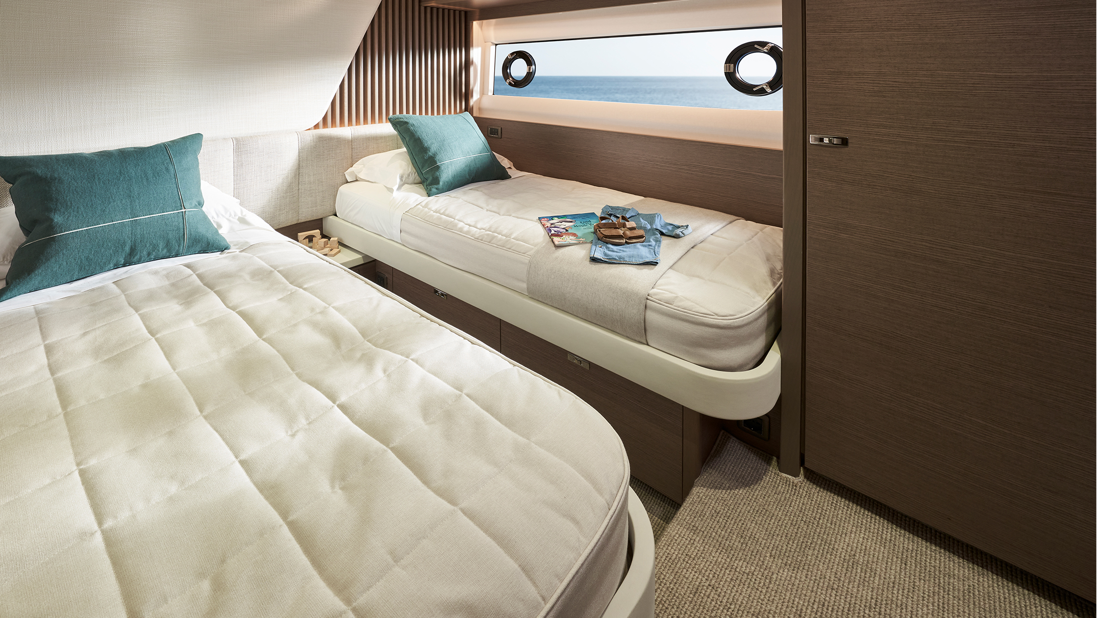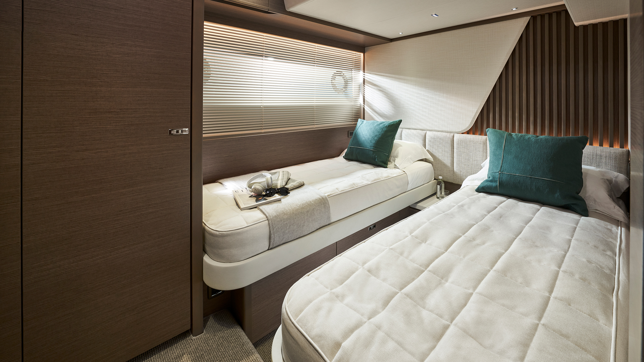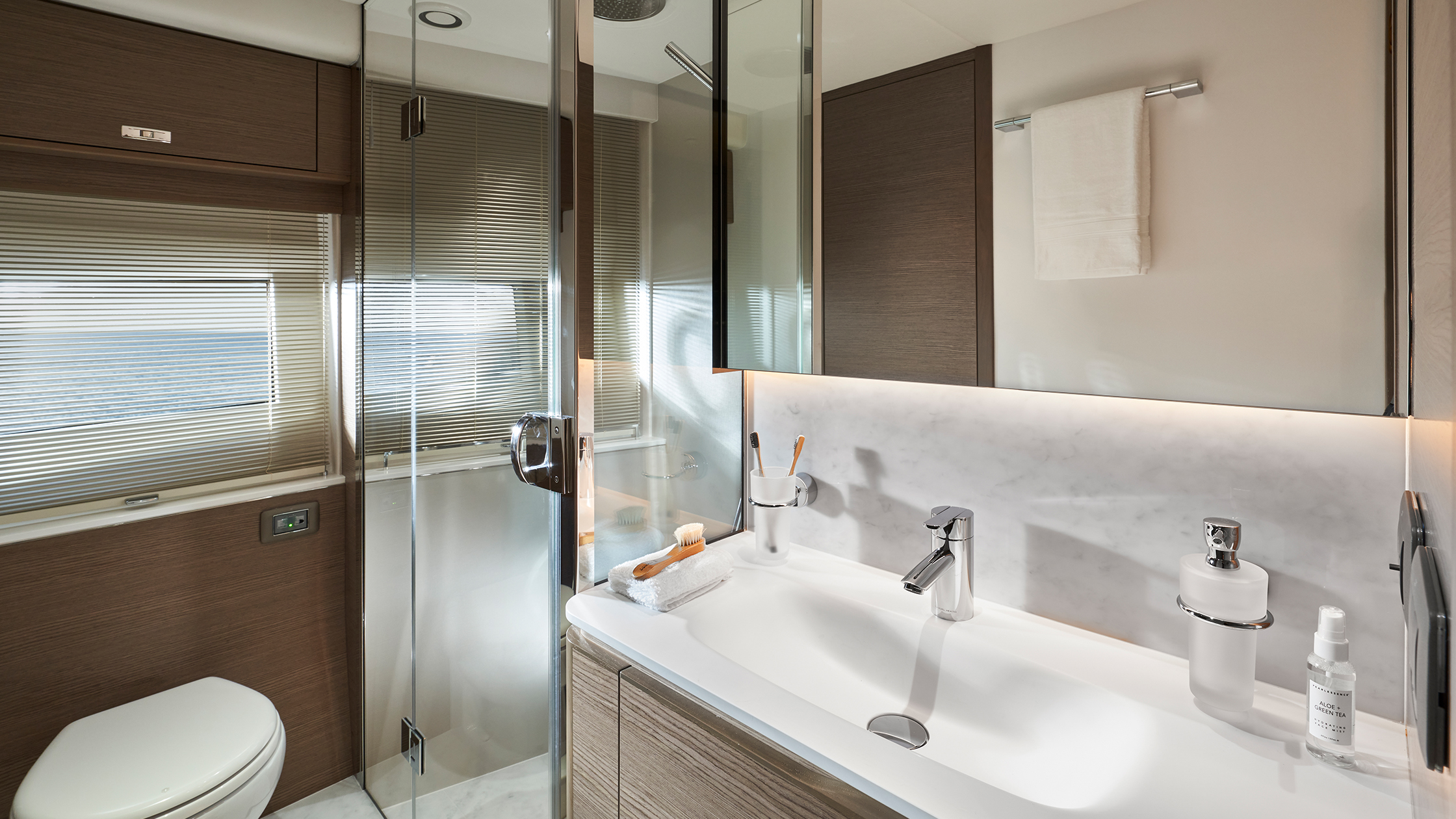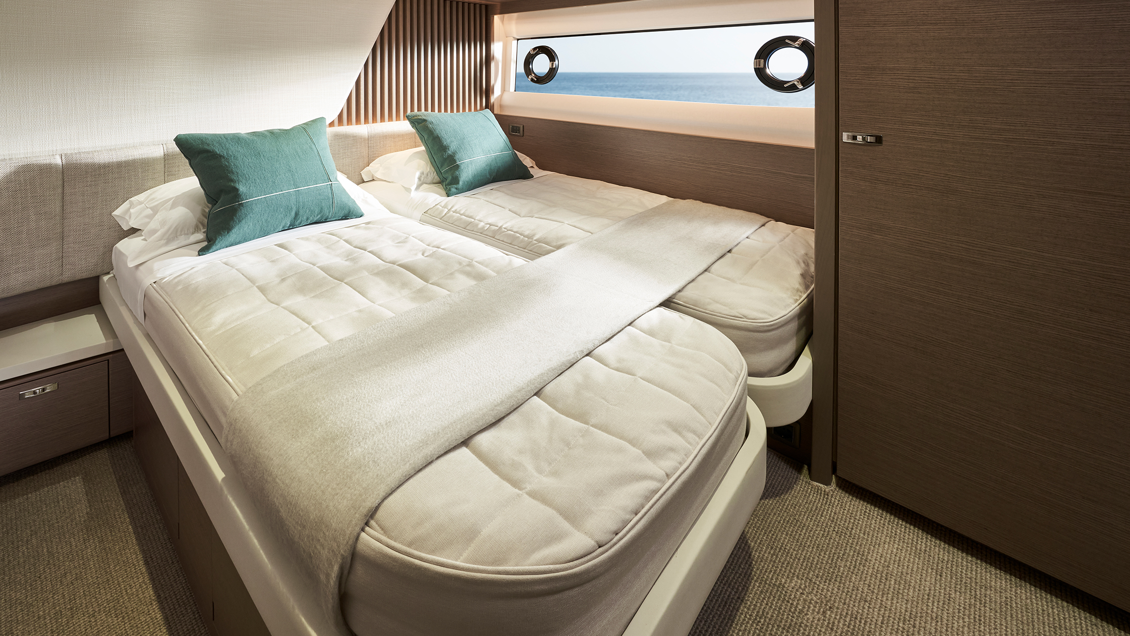Die Eignerkabine, die die ganze Bootsbreite einnimmt, präsentiert sich besonders edel. Dafür sorgen architektonisch inspirierte Wandtafeln, frisch wirkende Leinentapeten, ein bronzefarbener Spiegel und ein mit Livorno Stone-Leder bezogener Schminktisch. Eine eigene Treppe führt über einen privaten, mit dem Salon verbundenen Lobbybereich zum Hauptdeck.