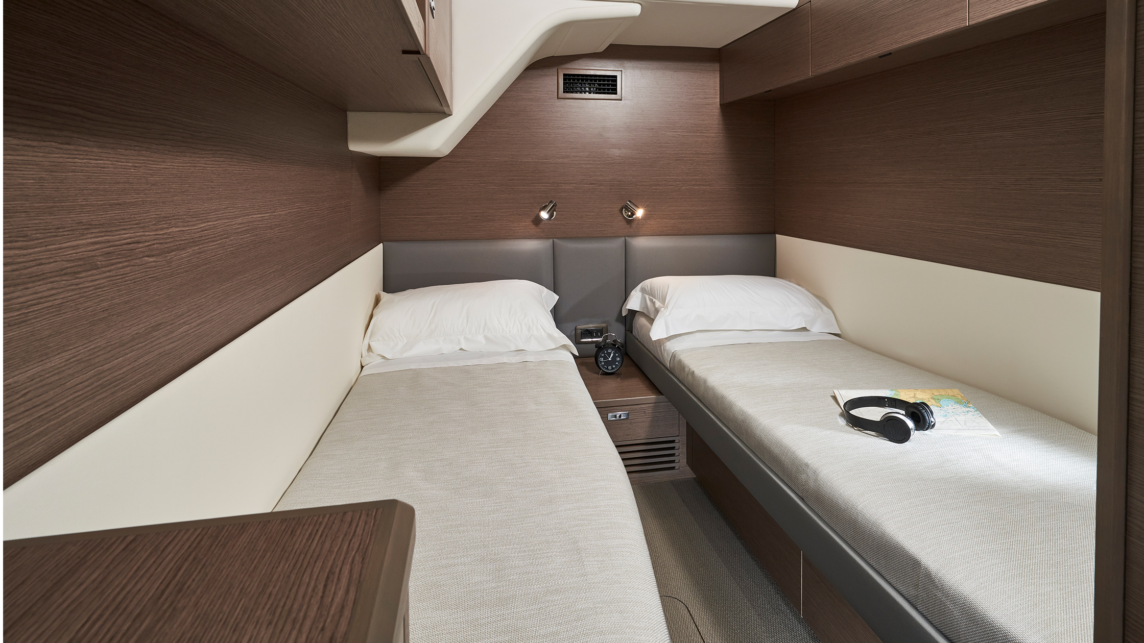 Im Bugbereich des Unterdecks können sich sechs Personen an drei wunderschön eingerichteten Gästekabinen erfreuen. Achtern befindet sich eine weitere Kabine mit zwei Einzelbetten und eigenem Bad für die Besatzung oder weitere Gäste.