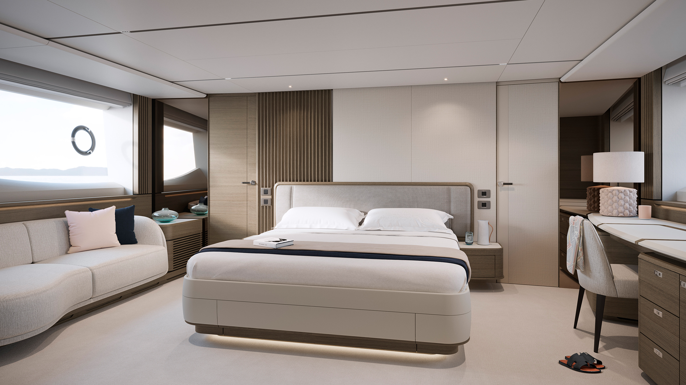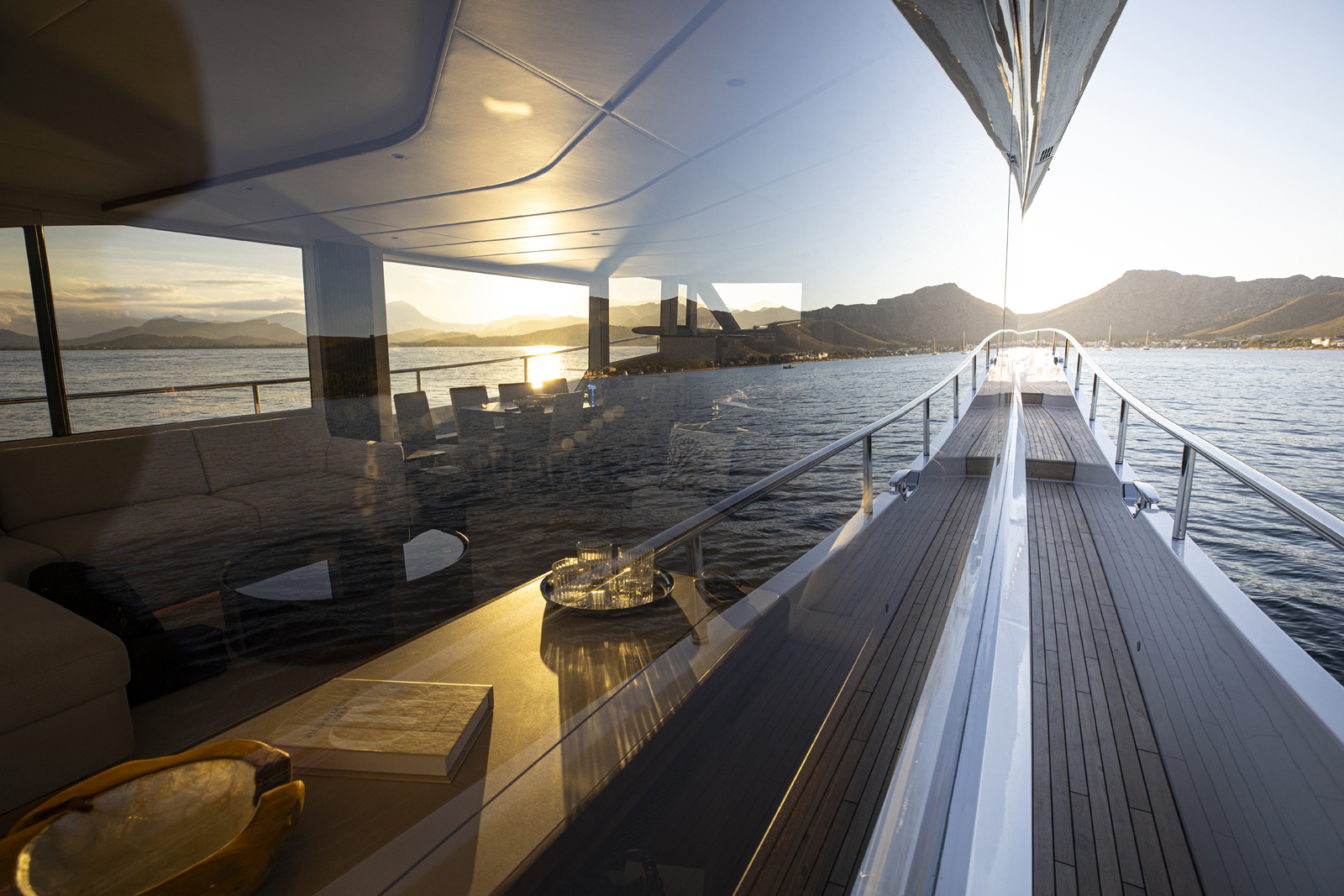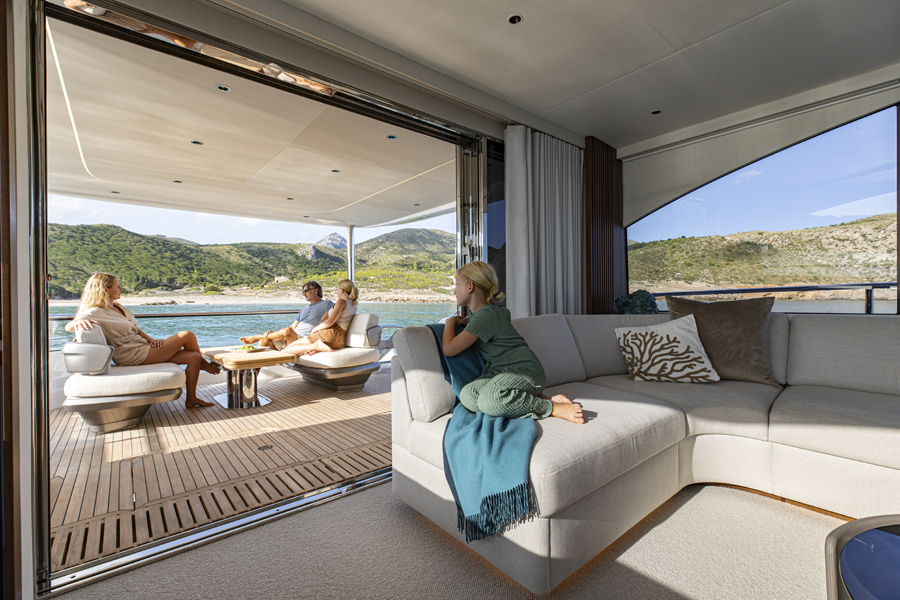 Das Hauptdeck führt nahtlos vom Cockpit bis zum Steuerstand, wobei die riesigen Fenster des Salons einen herrlichen Panoramablick gewähren. Für Eigner, die es lieber etwas privater haben, sind optionale Raumteiler für die Kombüse und das Steuerhaus erhältlich.