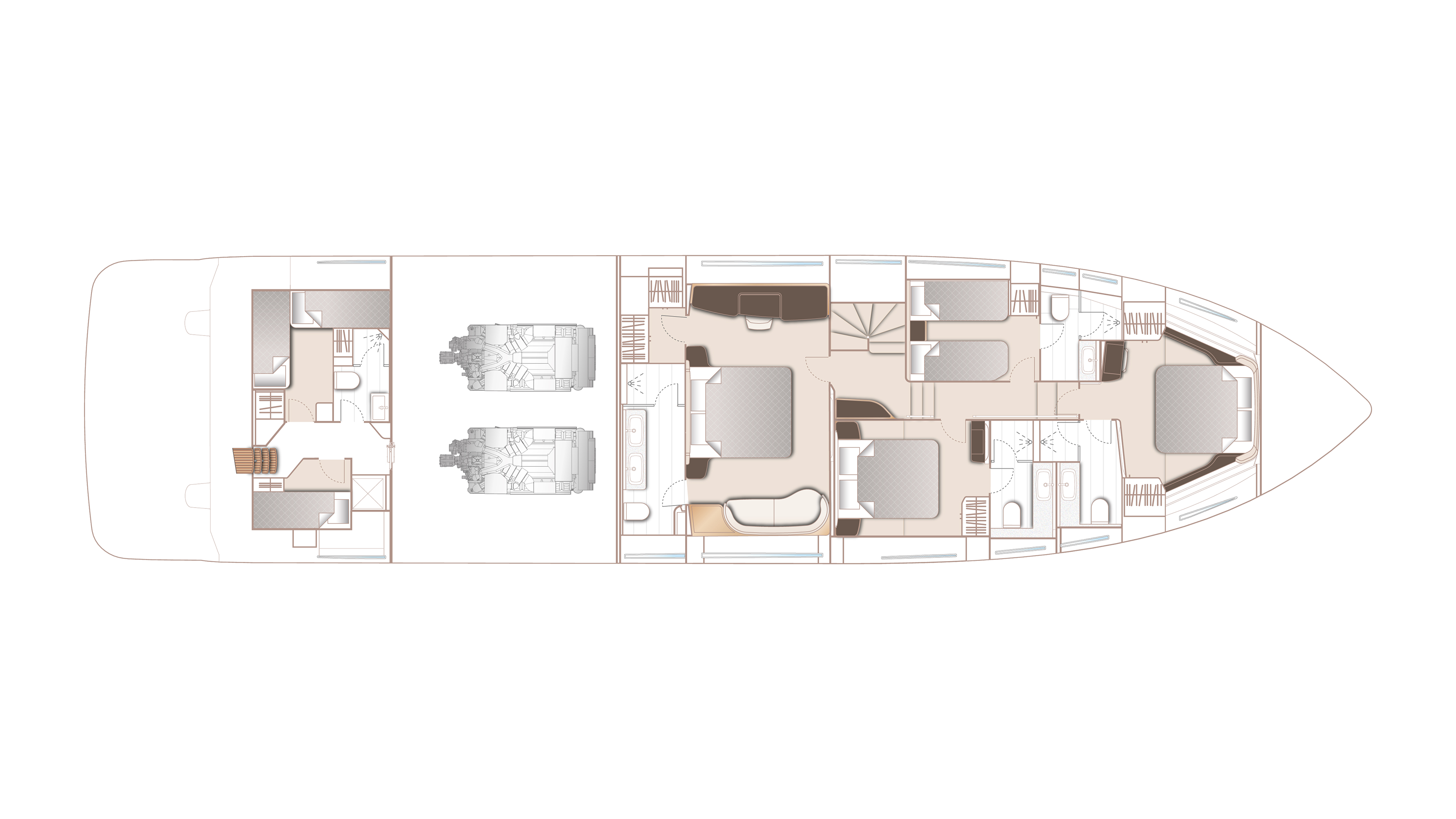 Das Vordeck dient als abgeschiedener Rückzugsort oder eleganter Bereich für die Bewirtung von Gästen. Im gemütlichen Sitzbereich finden zehn Personen mühelos Platz. Zudem lassen sich die flexiblen, nach vorne und hinten gerichteten U-förmigen Sitzgelegenheiten in eine großzügige Sonnenliege umwandeln.