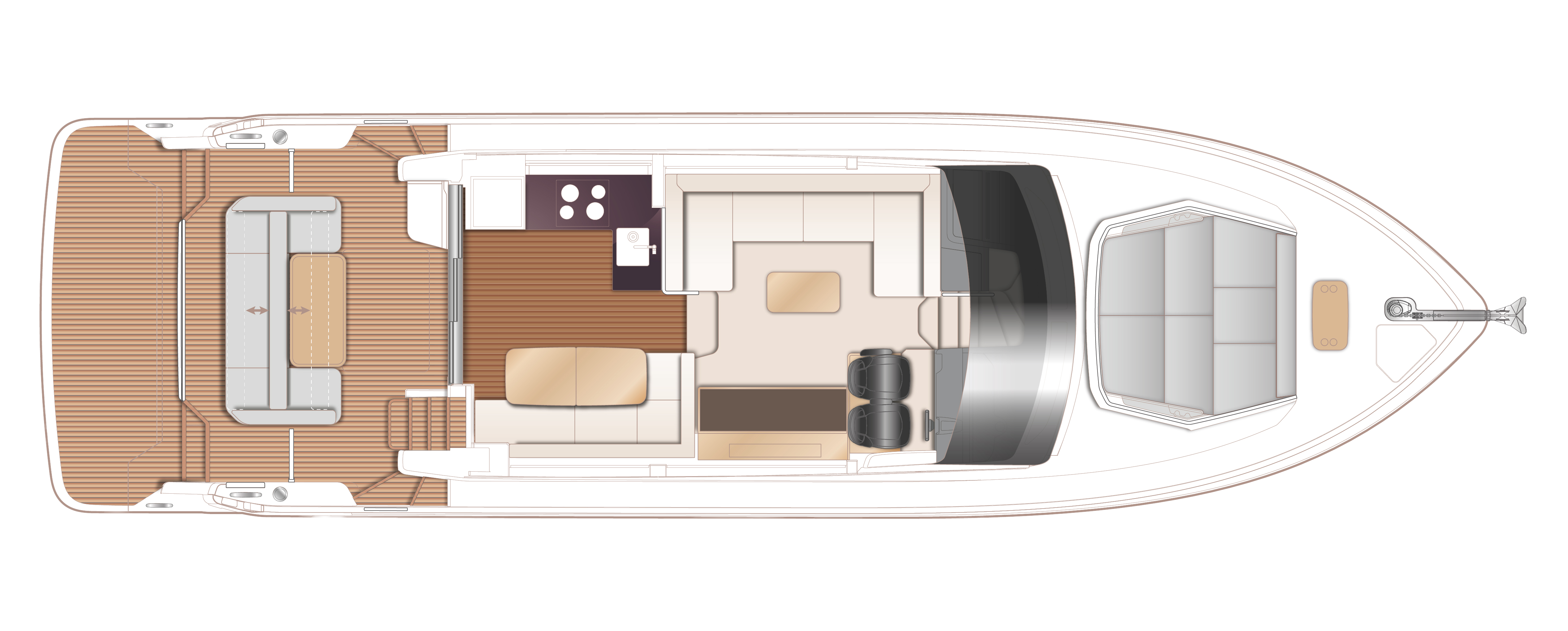 En el interior, el salón de la cubierta principal cuenta con una cocina de popa con una zona comedor independiente, una característica exclusiva de yates de estas dimensiones que genera una sensación de mayor amplitud y flexibilidad. Bajo la cubierta, pueden alojarse hasta seis invitados en tres cabinas, incluido un camarote principal de manga completa con un baño en suite, una cabina de proa con cama de matrimonio y una cabina con dos camas individuales, que se puede convertir en una de matrimonio de forma opcional. Se puede equipar también con una cabina de tripulante de popa, también de forma opcional, con una litera individual, baño y espacio de almacenamiento.