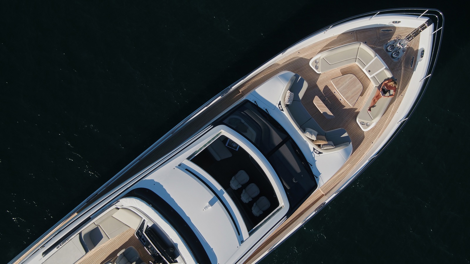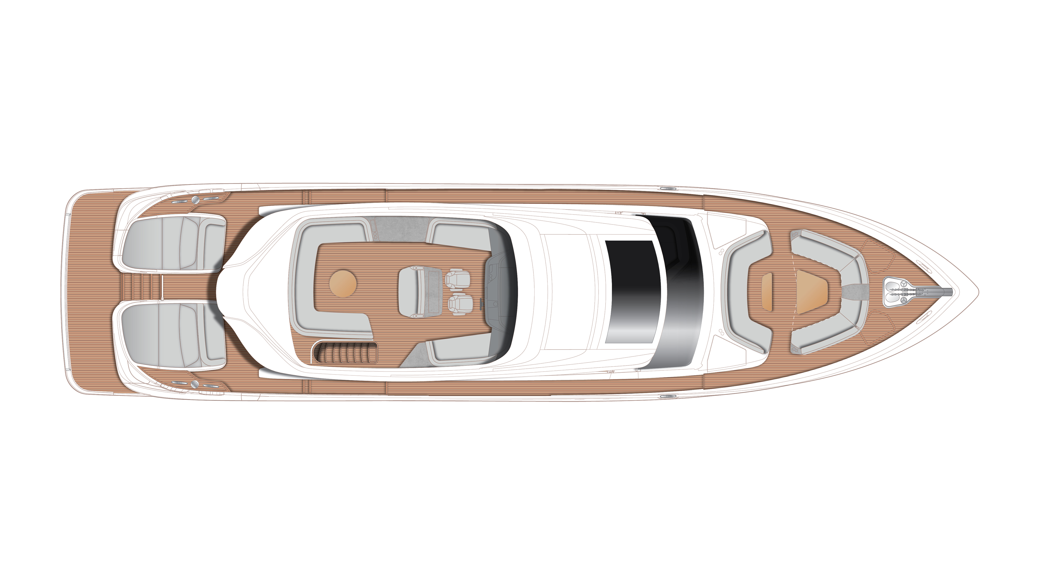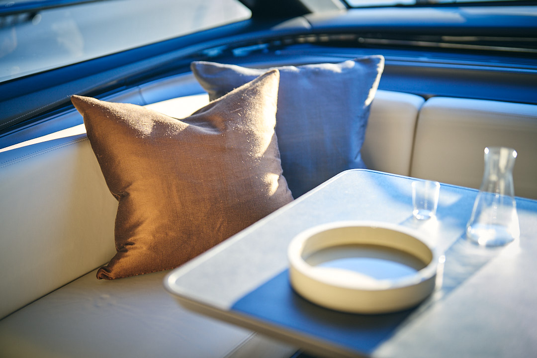 La bañera se caracteriza por una gran versatilidad, gracias a sus asientos configurables, con dos asientos tapizados en forma de L que se pueden inclinar manualmente hacia dentro, hacia afuera y hacia adelante. Dos tumbonas de popa flanquean las escaleras de teca que conducen a la espaciosa plataforma de baño electrohidráulica.