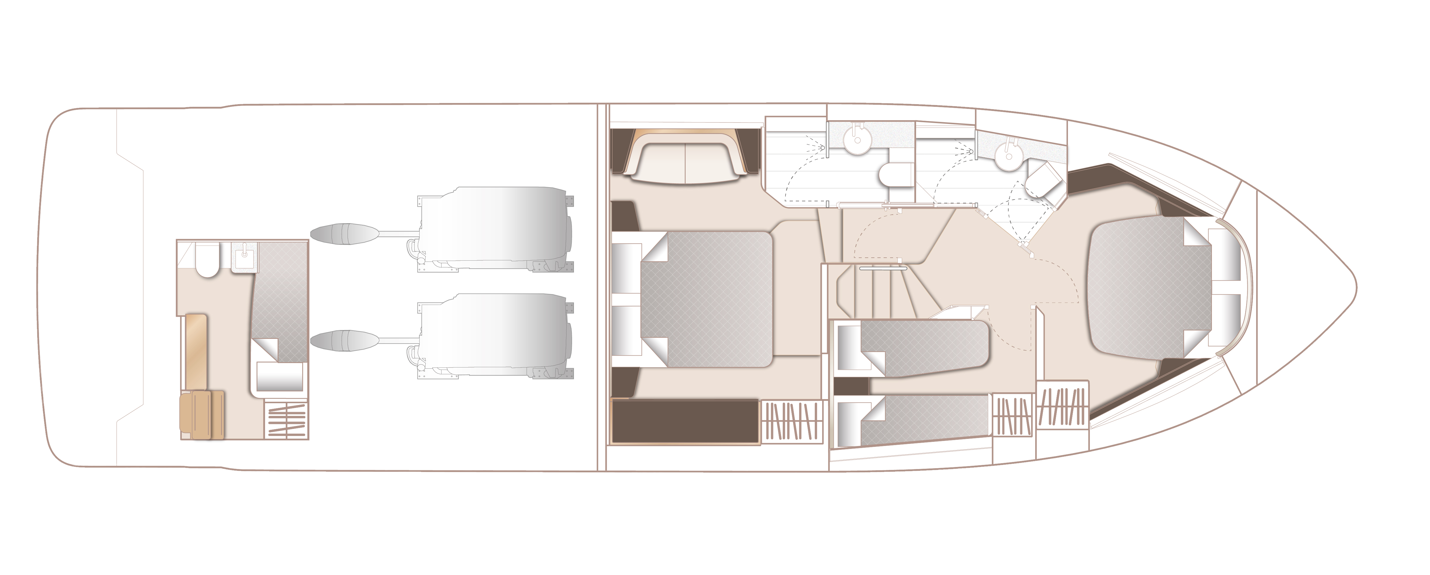 主甲板客厅采用船尾厨房布局,配有独立餐区,在同级别游艇中极为罕见,进一步提升了空间感与灵活性。下层甲板设有三间客舱,可容纳最多六位宾客,包括一间带独立卫浴的全宽主卧舱、一间位于船首的双人舱,以及一间可转换为双人床的双床客舱。可选配尾部船员舱,内设单人双层床、卫生间及储物空间。