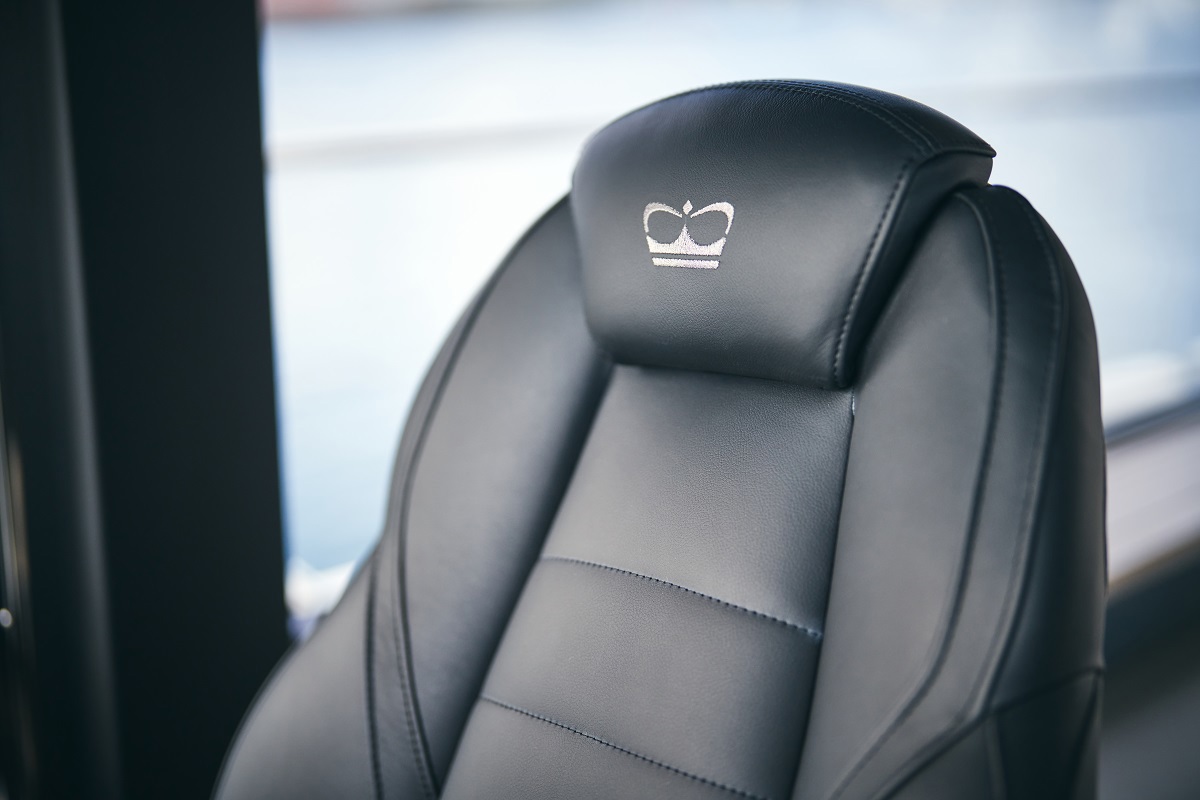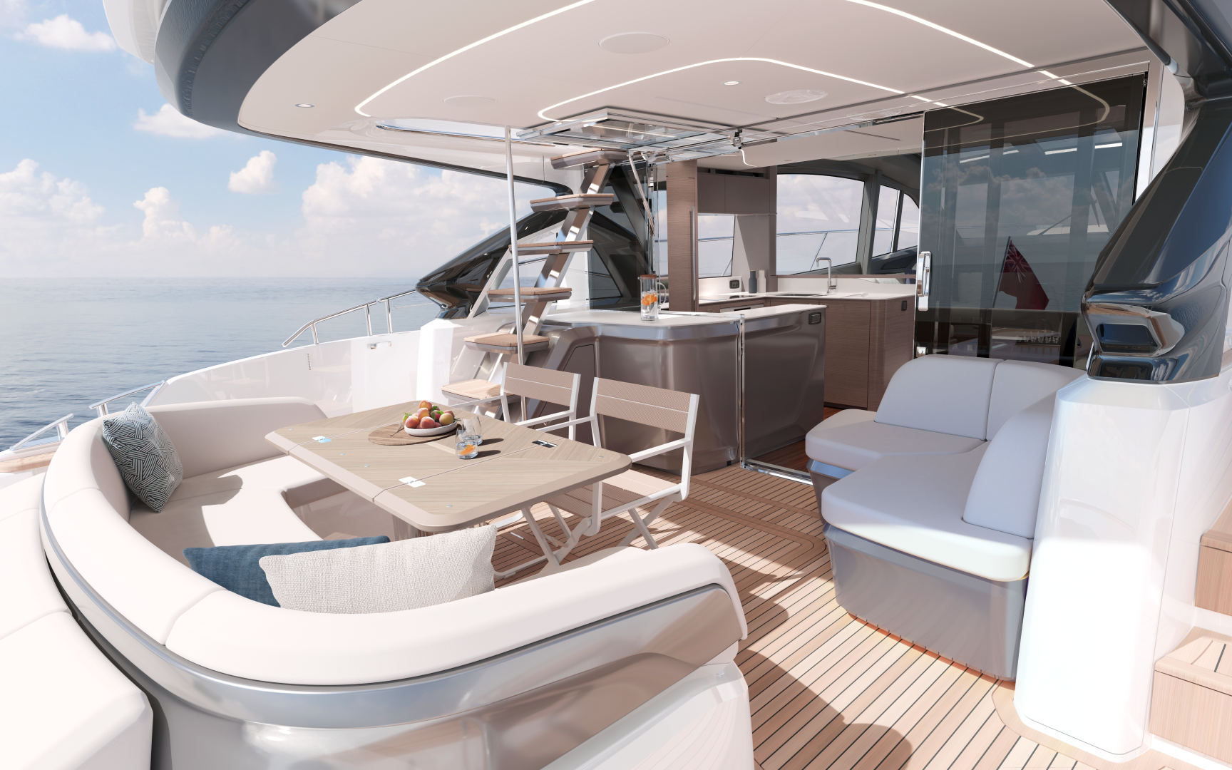 甲板区域宽大开阔,拥有宽敞舒适的前甲板座位区、船尾日光浴垫、液压升降式游泳平台以及 3.3 米的快艇库,可作为各种水上运动的完美基地。