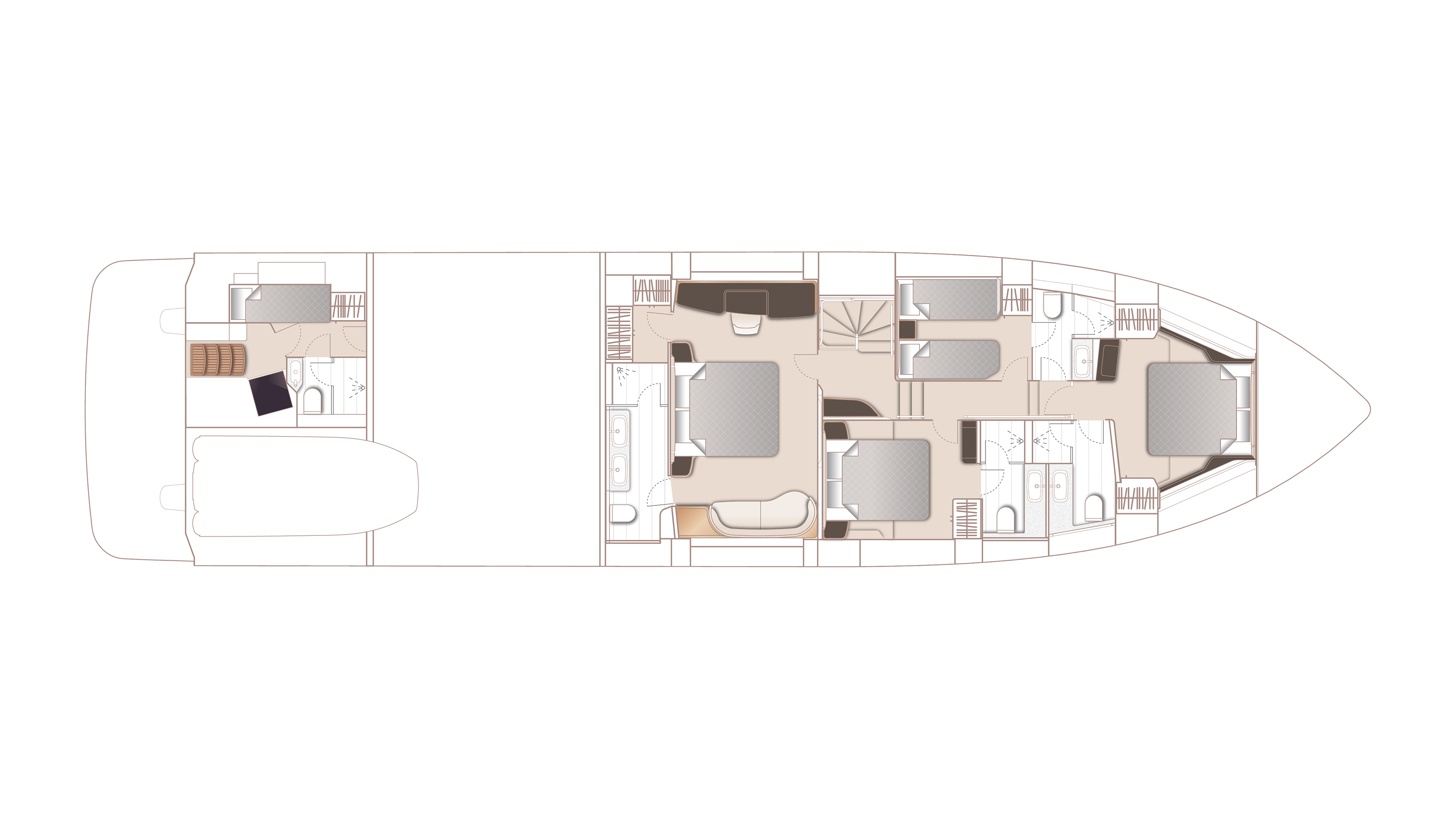 主甲板下设有四间精美考究的独卫卧舱,通过优雅的船体舷窗采纳充足的自然光,可供八位宾客入住,此外还设有一间双床船尾卧舱,可供宾客临时入住或船员使用。位于船中部的全宽式主卧舱拥有通向主甲板的专属楼梯以及位于主甲板舱梯口的私享前厅。